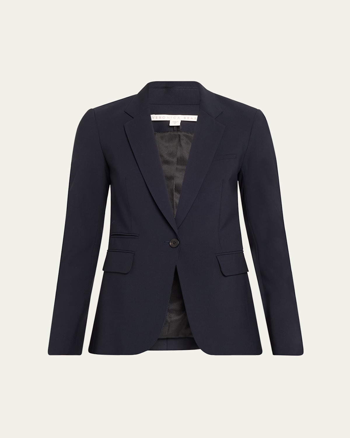 Veronica Beard Classic jacket in crepe. Notch collar; button front. Long sleeves. Side pockets. Slim fit. Wool/spandex. Made in USA of imported material.