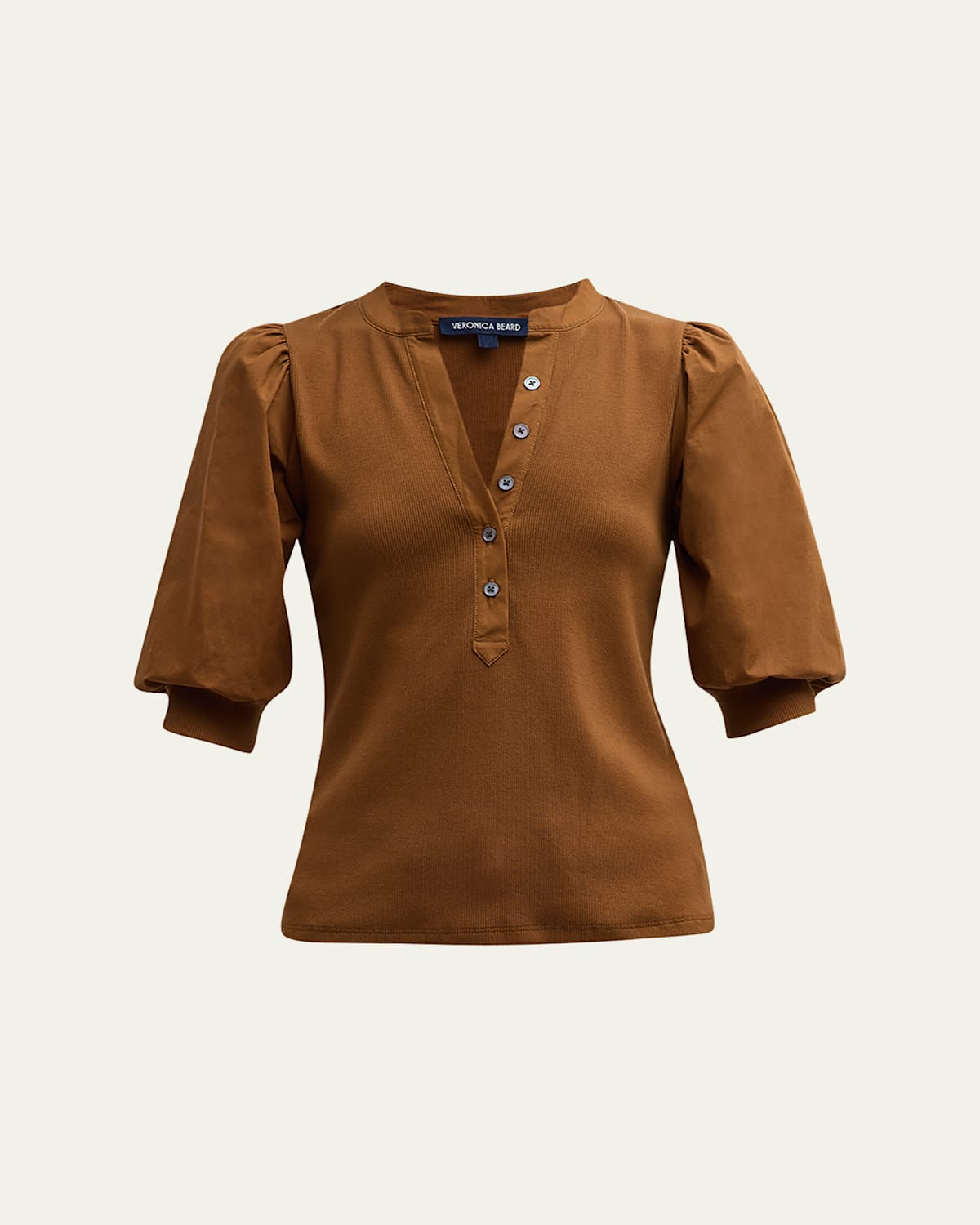 Veronica Beard Jeans "Coralee" knit top featuring short puffed sleeves V neckline Easy fit Hem sits at the hip Half buttonfront Cotton/elastane Machine wash cold Imported