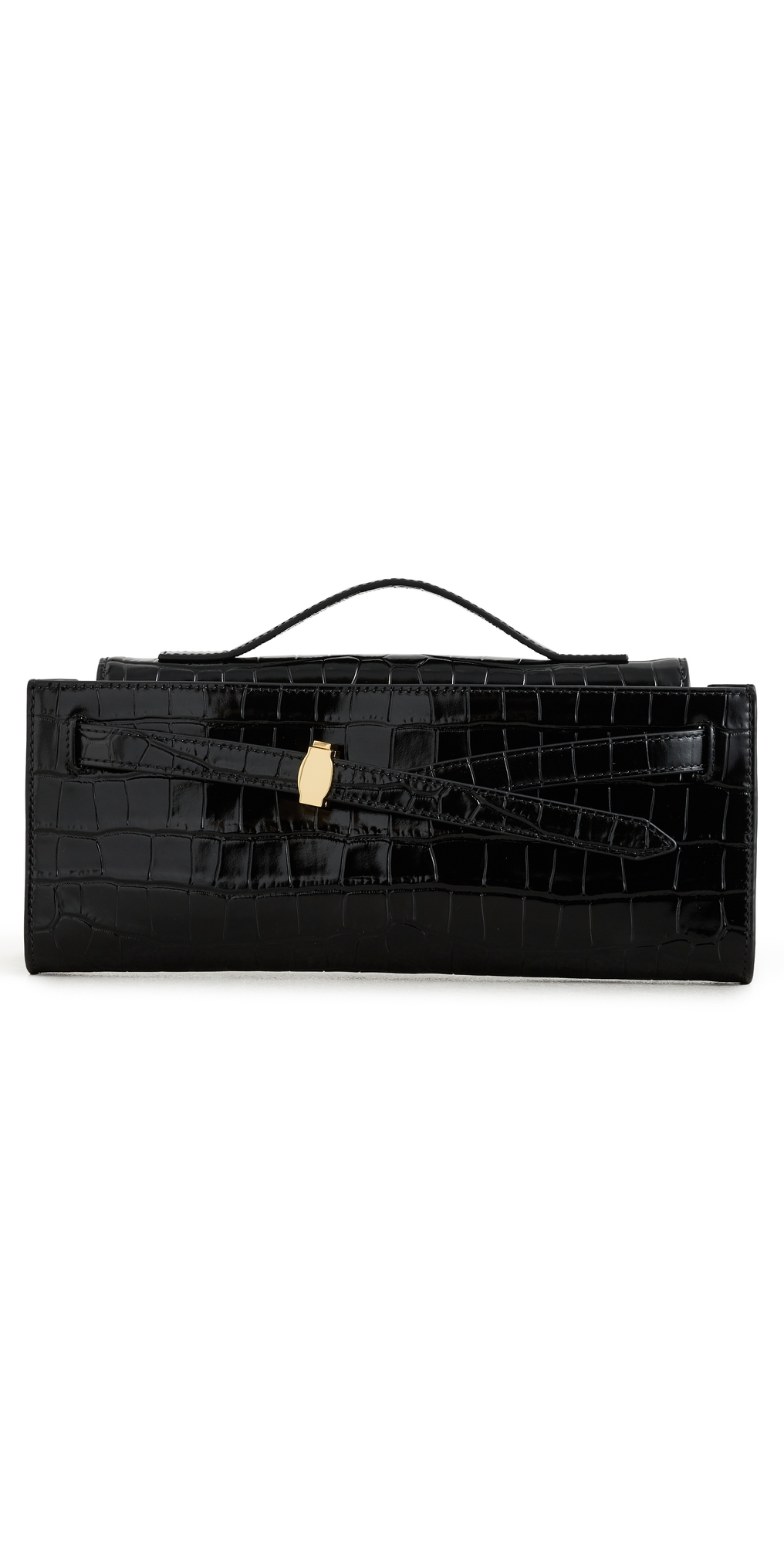 Leather. Croc embossed finish. Adjustable belt strap at front. Gold-tone hardware. Fold-over flap with magnetic closure. Zip interior pocket. Optional, adjustable strap. Lining: Microfiber. Weight: 15oz / 0.43kg. Imported, Vietnam. Measurements: Height: 5.5in / 14cm Length: 12.25in / 31cm Depth: 1.25in / 3cm Strap drop: 9.5in / 24cm Handle drop: 1.25in / 3cm