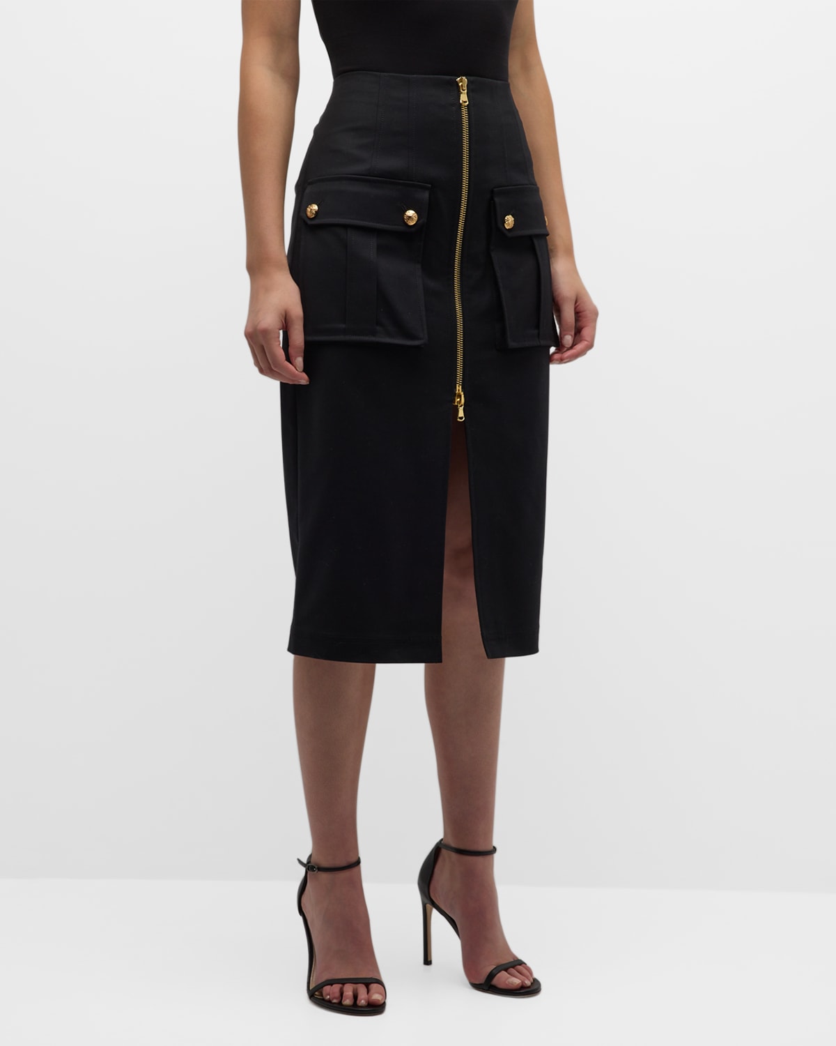 Veronica Beard "Dallas" midi skirt featuring goldtone hardware in stretchcotton High rise Flap pockets Pencil style Cutaway hem Exposed twoway zip front Cotton/elastane Dry clean Imported