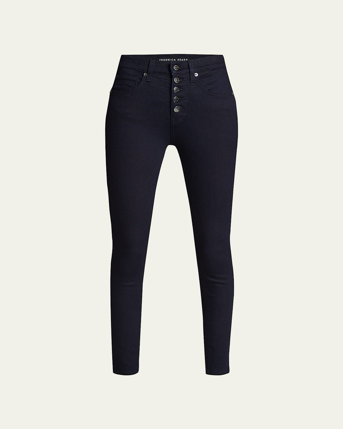 Veronica Beard "Debbie" jeans in stretch denim. High rise. Fivepocket style. Fitted through skinny legs. Ankle length. Exposed button fly; belt loops. Cotton/polyester. Made in USA.