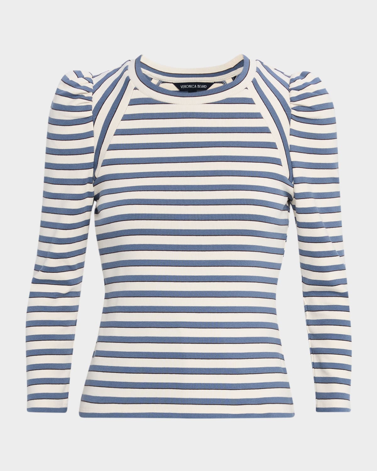 Veronica Beard "Delano" striped top elevated with puff sleeves Crew neckline Bracelet sleeves Easy fit Hem falls to the hip Pullover style Cotton/elastane Machine wash cold Imported