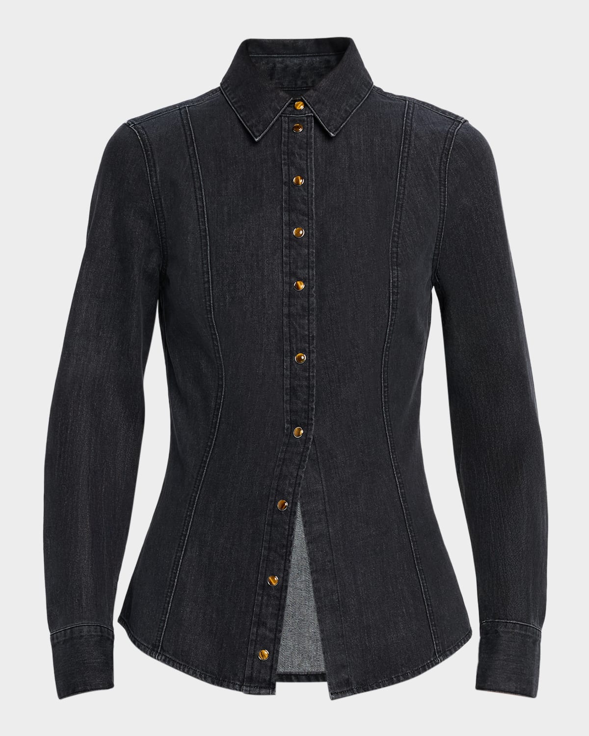 The "Eddie" shirt by Veronica Beard is constructed of blackwash denim with bodycontouring seaming for a flattering silhouette Shirt collar; snap front Long sleeves; snap button cuffs Yoked back Slim fit Hip length Shirttail hem Cotton Imported
