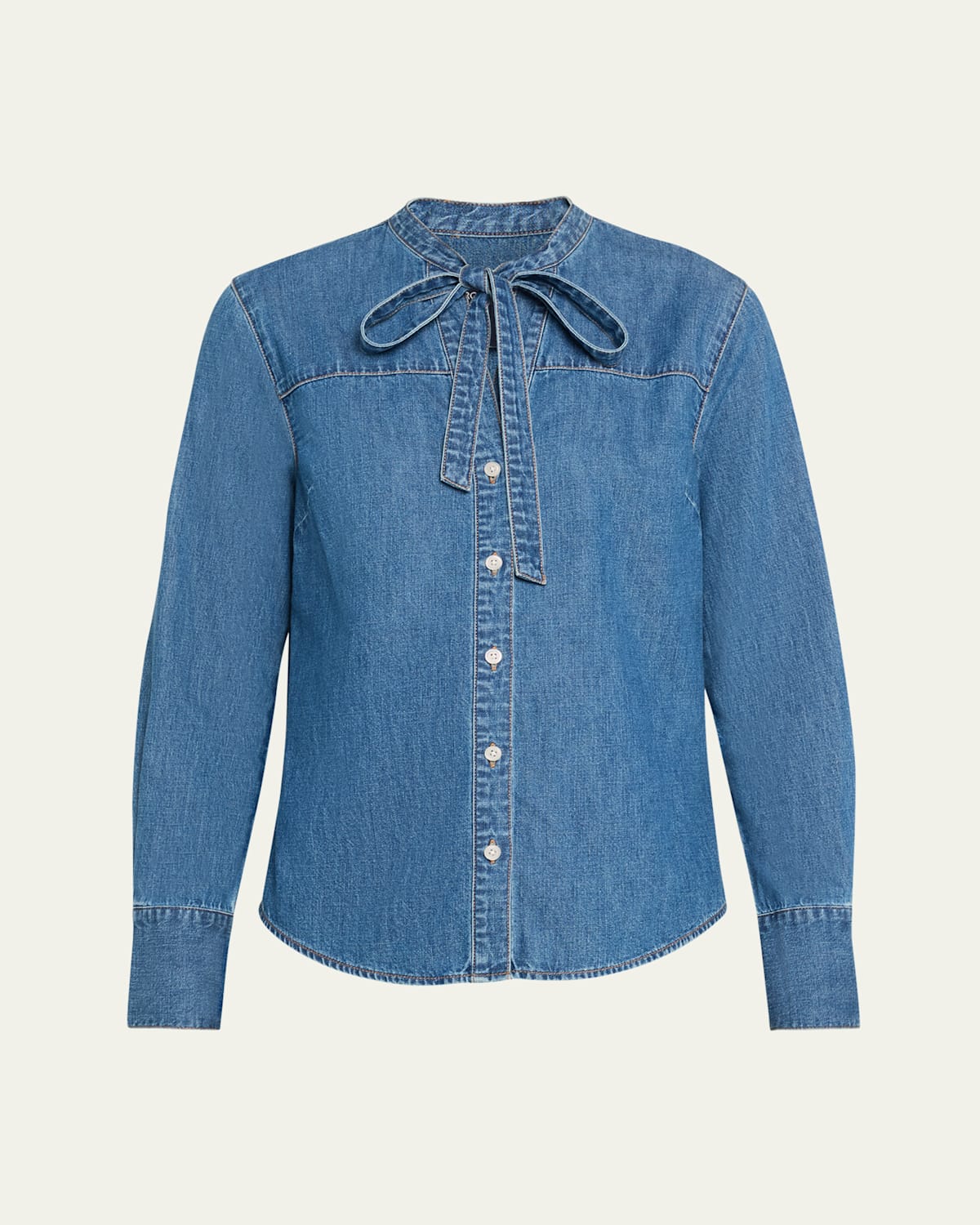 Veronica Beard "Gabby" shirt crafted in denim finished with a statement self tie V neckline Long sleeves with button cuffs Classic fit Hem falls to the hip Buttonfront Cotton Dry clean Imported