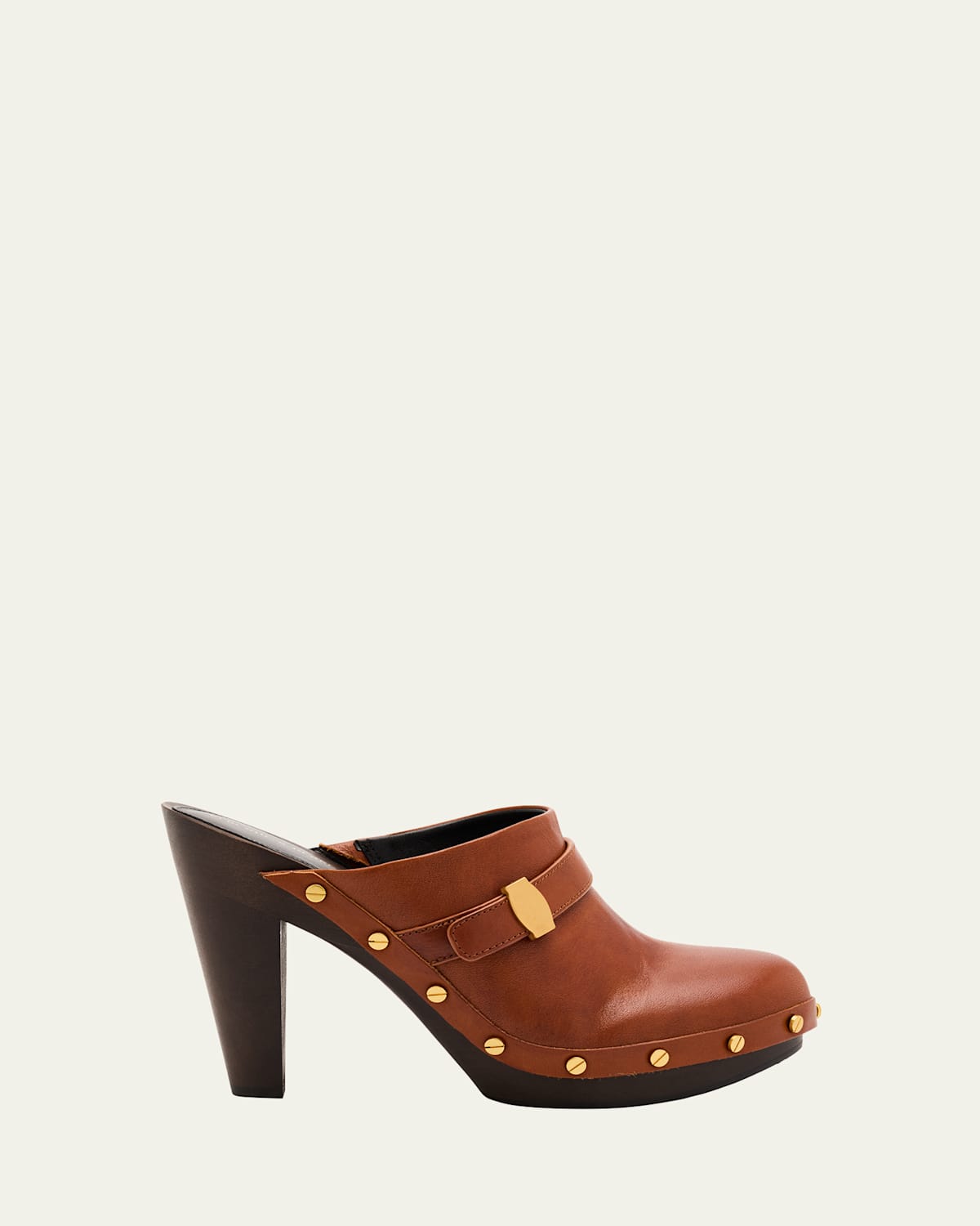 Veronica Beard "Giana" leather mules with goldtone hardware 4.33 in / 110 mm block heel; 1.00 in / 25 mm platform Round toe Easy slide style Rubber outsole Lining: Leather Spot clean Imported