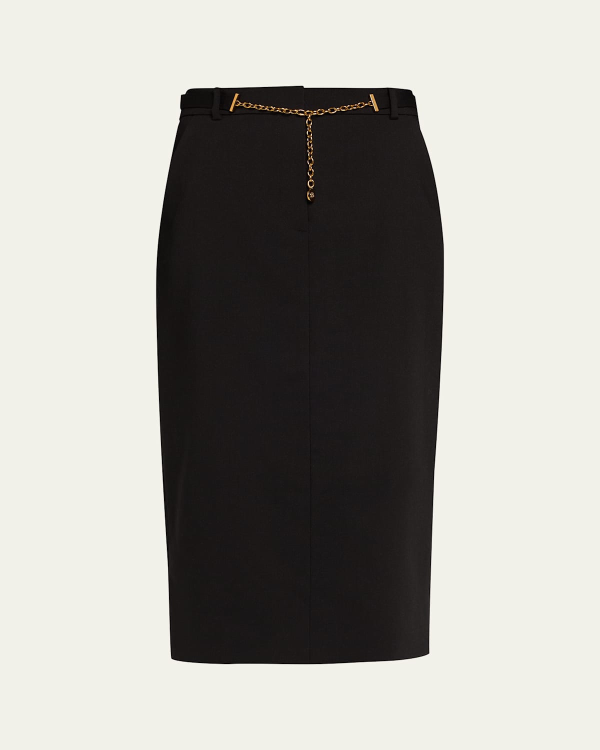 Adorned with a sophisticated chain belt, the "Hoffman" pencil skirt by Veronica Beard is crafted from premium stretch wool suiting for a polished, yet comfortable look High waist Slanted side and back welt pockets Hem falls below the knee Skirt falls straight from hip to hem Hidden hook/zip fly; belt loops Virgin wool/elastane Lining: Polyester Dry clean Imported