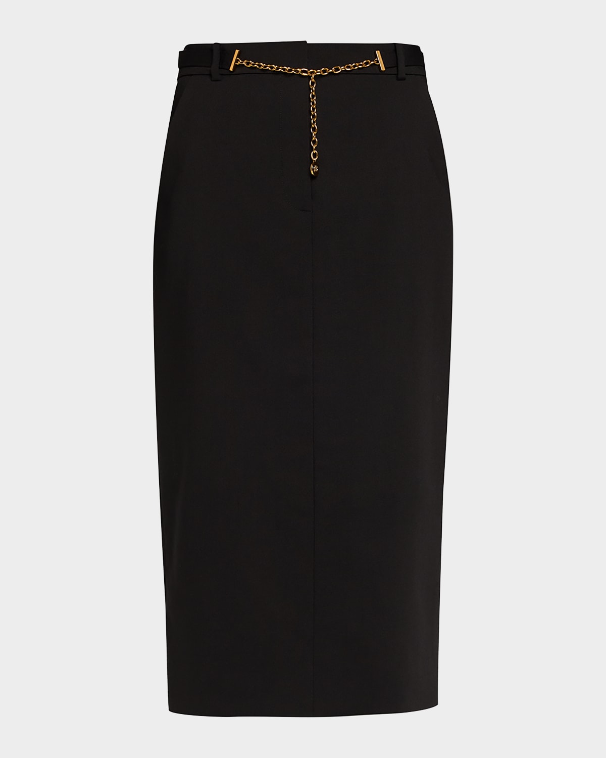 Adorned with a sophisticated chain belt, the "Hoffman" pencil skirt by Veronica Beard is crafted from premium stretch wool suiting for a polished, yet comfortable look High waist Slanted side and back welt pockets Hem falls below the knee Skirt falls straight from hip to hem Hidden hook/zip fly; belt loops Virgin wool/elastane Lining: Polyester Dry clean Imported