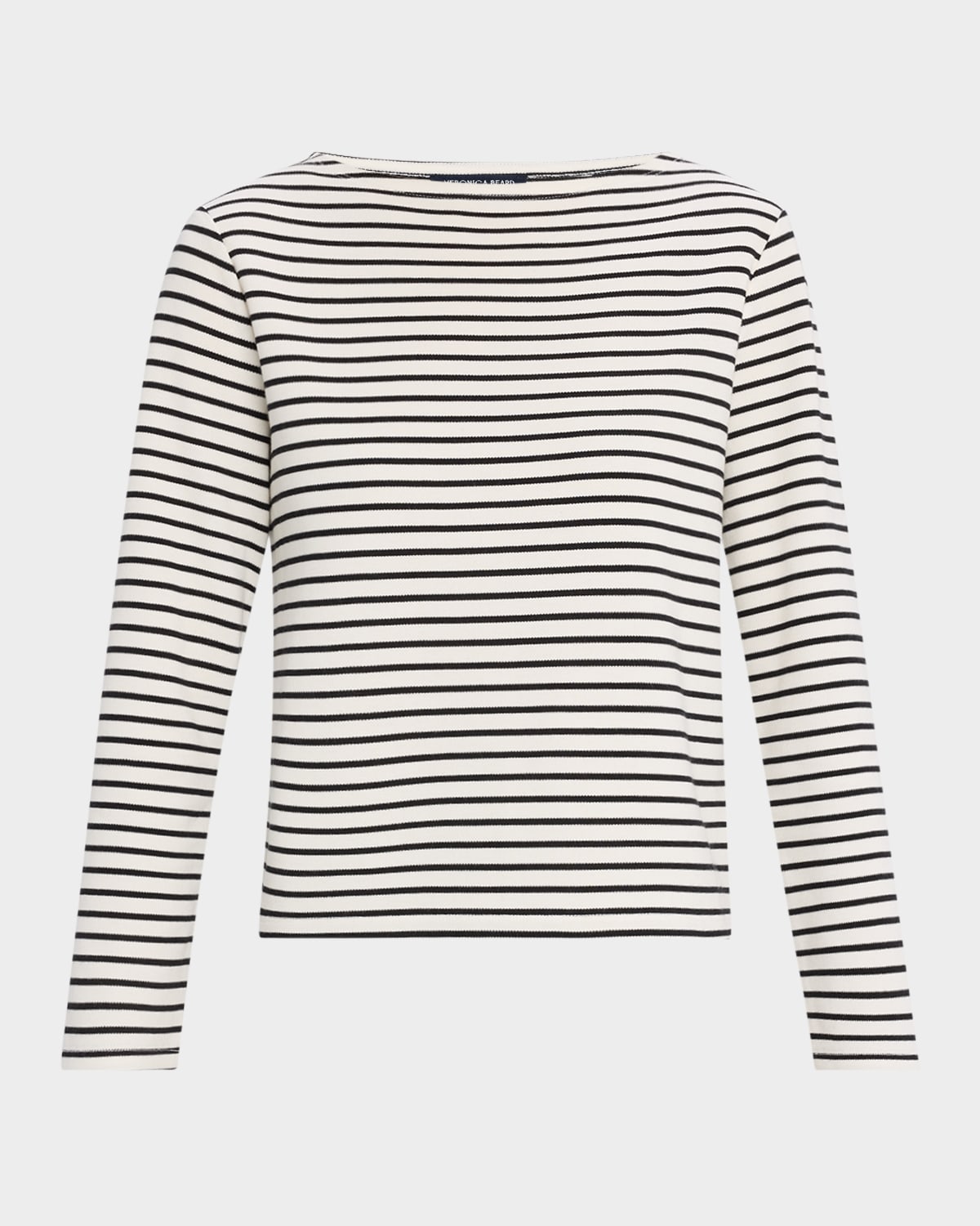 Veronica Beard "Hovey" striped boatneck top Long sleeves; approx. 29"L Classic fit Hem falls to the hip Pullover style Polyester/cotton Machine wash cold Imported