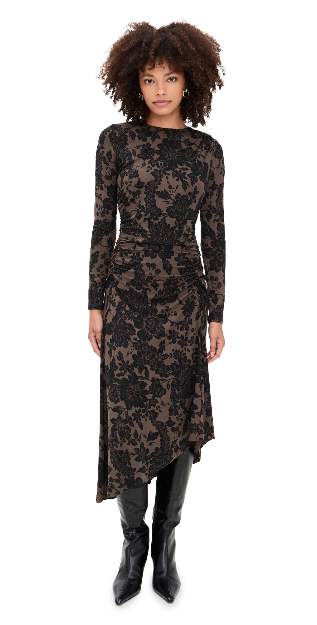 Fabric: Lightweight, super-stretch jersey. Floral print. Ruched sides. High-low and asymmetrical hem. Midi length. Crew neck. Long sleeves. Pullover design, no closure. Shell: 93% lyocell/7% elastane. Double-layered at bust. Wash cold. Imported, Vietnam. Measurements: Measurements from size XS Length: 43.25-49.25in / 110.0-125.0cm, from shoulder