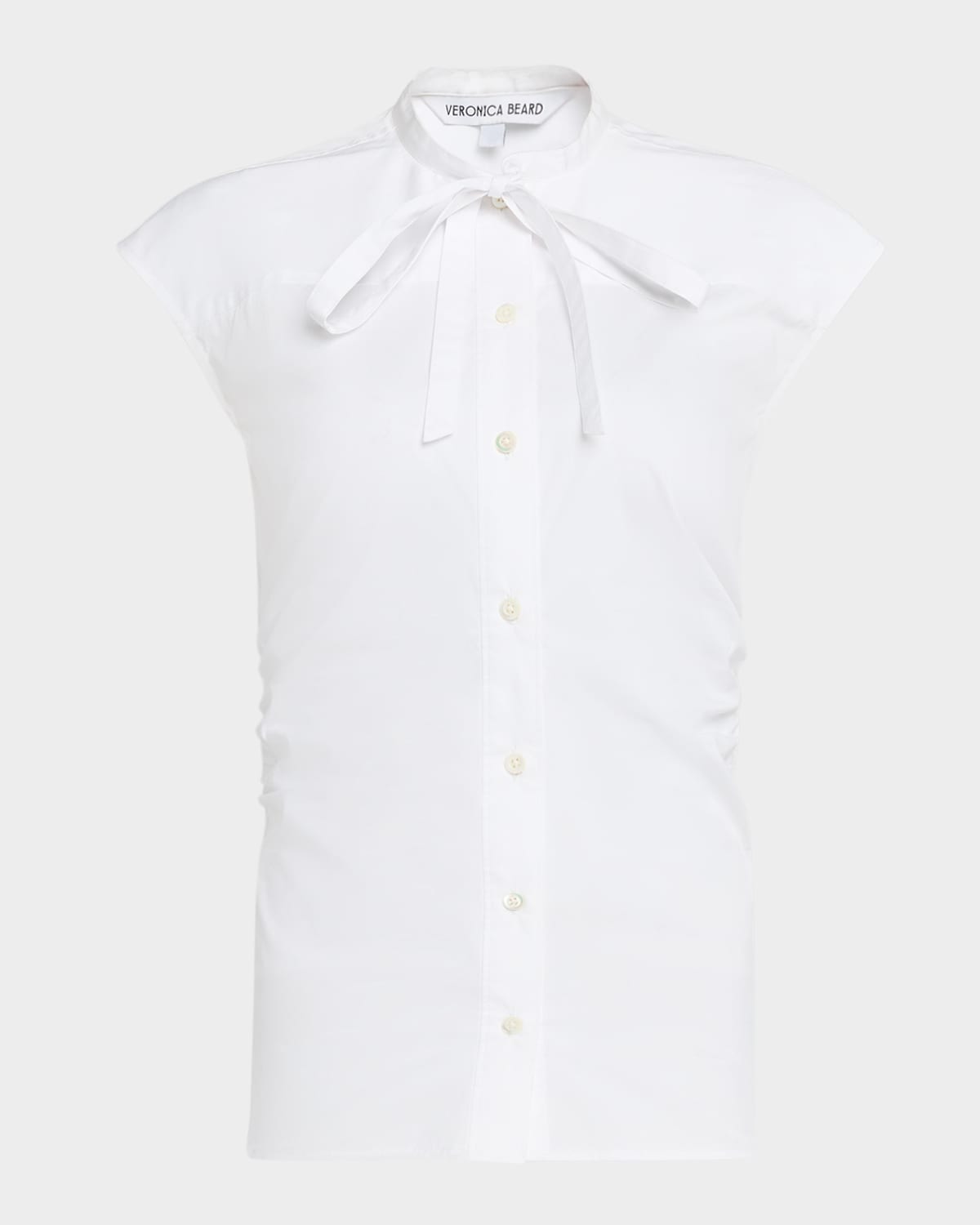 Crafted from lightweight stretch cotton, the "Joon" top by Veronica Beard is a fresh take on the classic buttondown. High neckline with selftie Sleeveless Fitted silhouette Hem sits at the hip Buttonfront Cotton/elastane Unlined Dry clean Imported