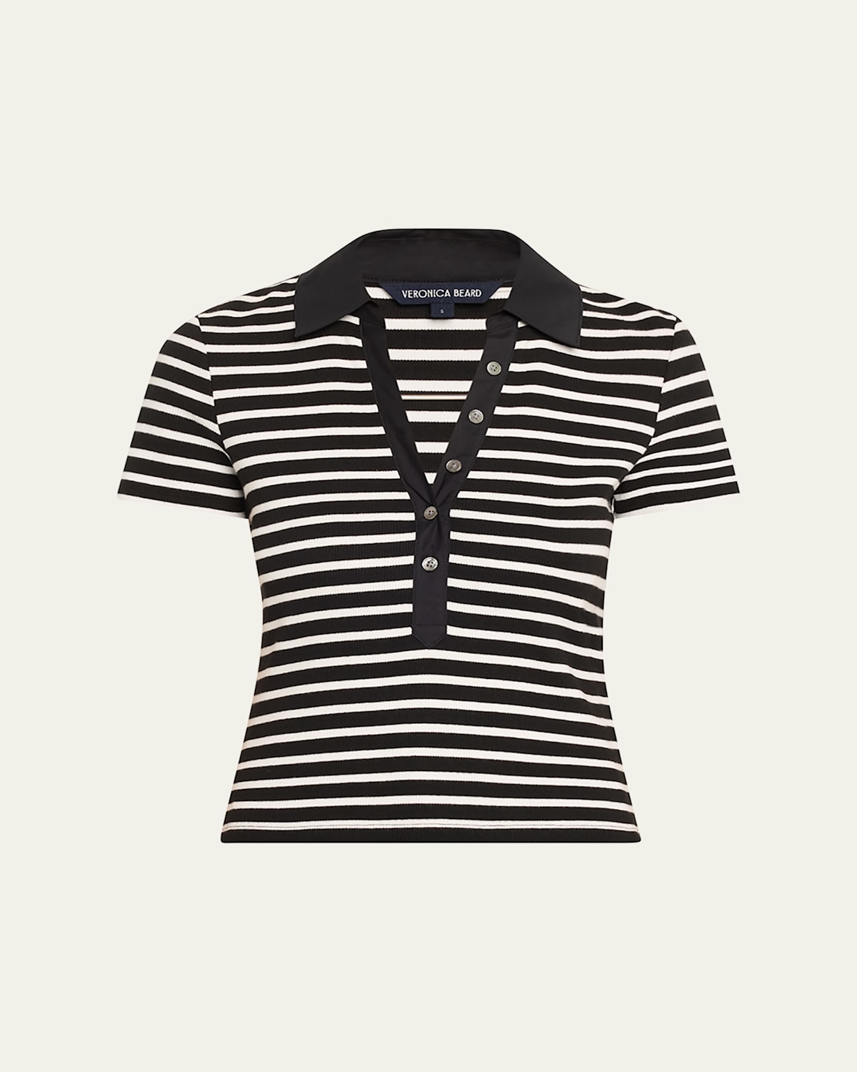 Veronica Beard "Kearney" stripe ribbed buttonfront polo tee Point collar; V neckline Short sleeves; approx. 14.3"L Cropped fit Hem sits at the hip Pullover style Cotton Machine wash cold Imported