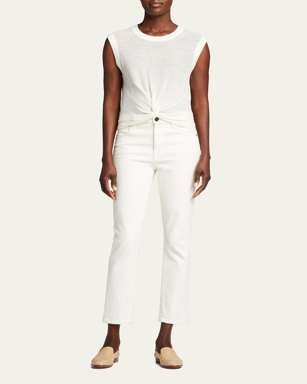 Veronica Beard "Kellen" semisheer knit top. Crew neckline; twist front. Cap sleeves. Relaxed fit. Pullover style. Linen/nylon. Imported.