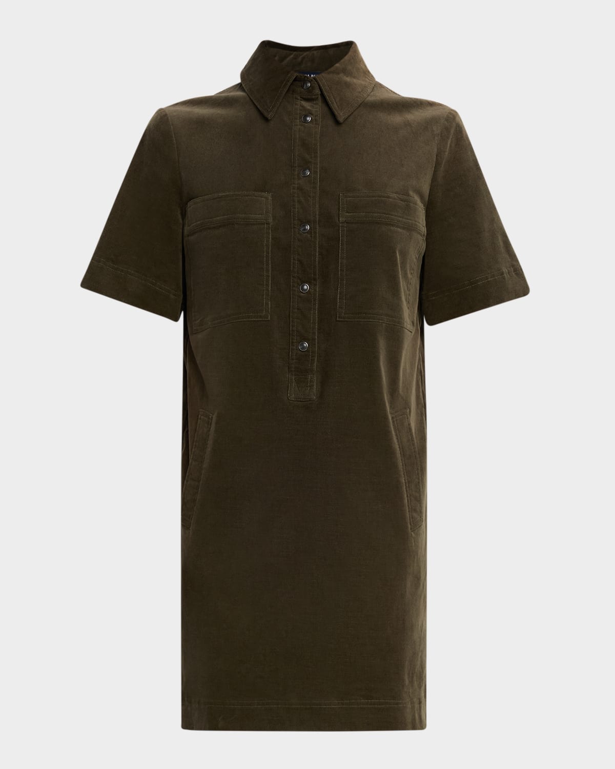 Veronica Beard "Koulis" mini shirtdress crafted in a seasonal corduroy Spread collar; snapplacket Short sleeves Dual chest pockets Shift silhouette Hem falls above the knee Slipover style Cotton/elastane Dry clean Imported