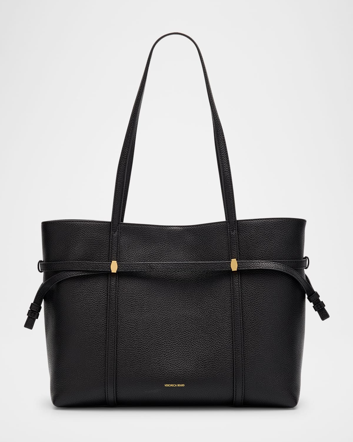 This "Lasso" eastwest tote bag from Veronica Beard is crafted in premium American embossed grain leather with an adjustable belt strap to cinch the silhouette Roomy interior fits a 14inch laptop Flat leather shoulder straps, 12" drop Open top with magnetic closure Interior, one zip pocket, three slip pockets Lining: Sueded microfiber Approx. 12.2"H x 18.1"W x 6.1"D Professional cleaning recommended Imported
