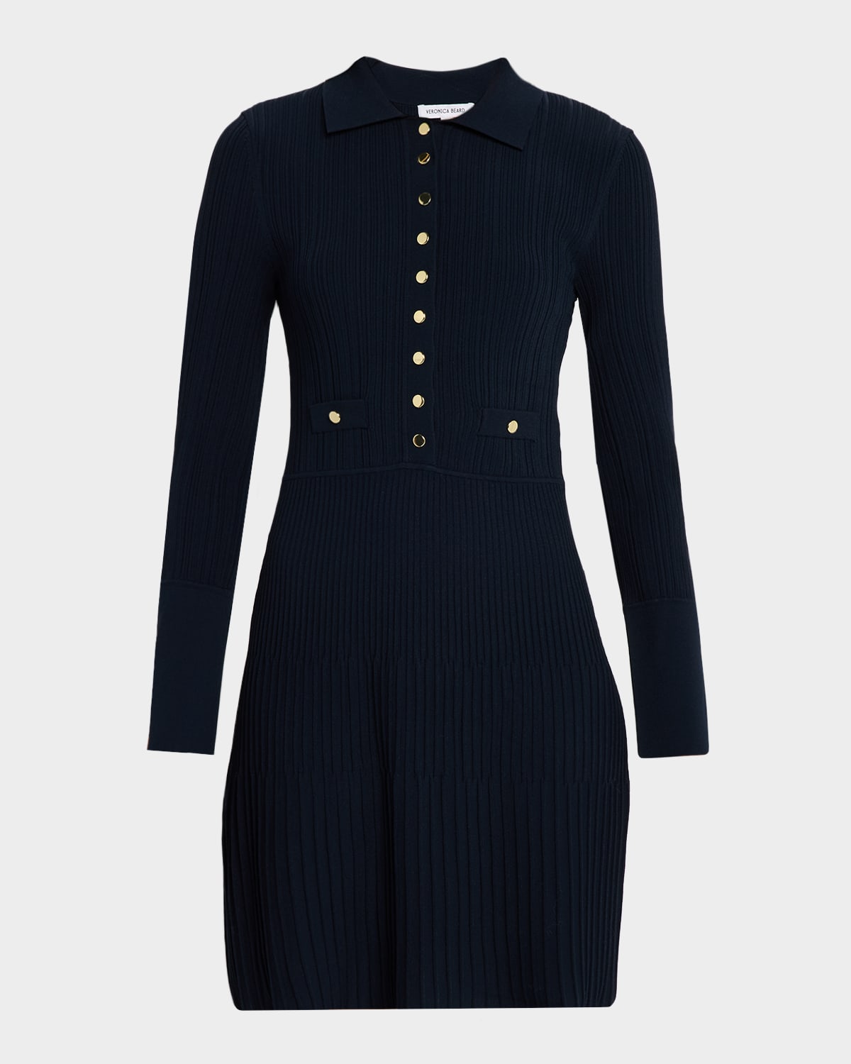 Crafted in ribbed stretchknit, the "Lauper" mini dress by Veronica Beard offers a comfortable, fitted silhouette finished with goldtone snaps for a polished look. Spread collar; snapplacket Long sleeves with elongated button cuffs Faux pockets Shirtdress silhouette Hem falls above the knee Slipover style Viscose/nylon/polyamide/polyester Dry clean only Imported