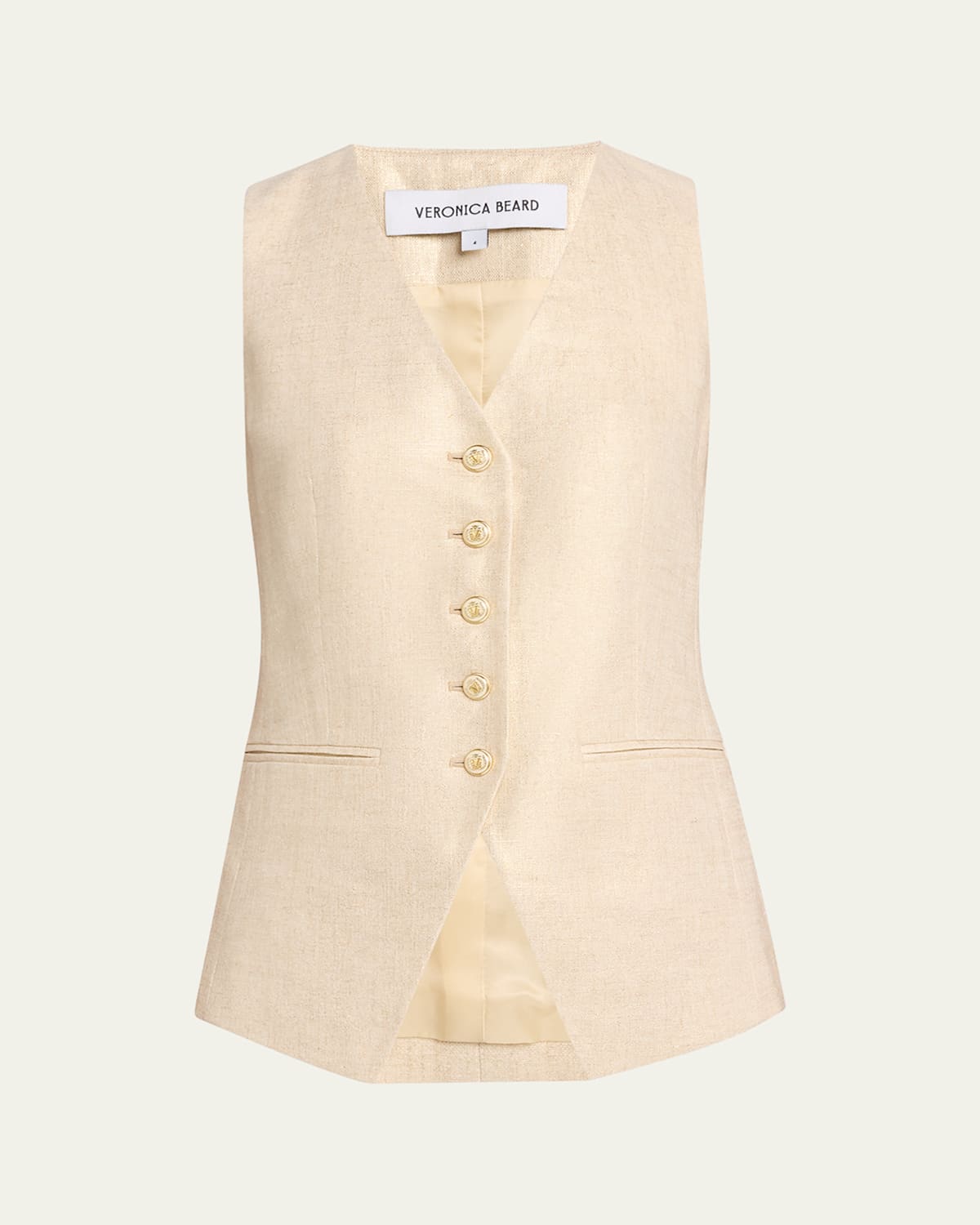 Veronica Beard "Liff" linen vest featuring a metallic sheen V neckline Sleeveless Adjustable back strap Hip welt pockets Tailored fit Cutaway hem Buttonfront Linen Dry clean Imported