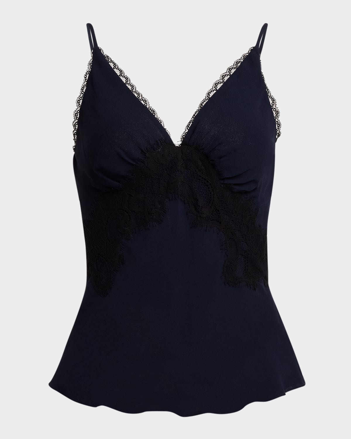 Veronica Beard "Lindsey" elevated cami with delicate lace trim V neckline Adjustable spaghetti straps Classic fit Hem sits at the hip Center back zip Viscose Lining: Polyester Dry clean Imported
