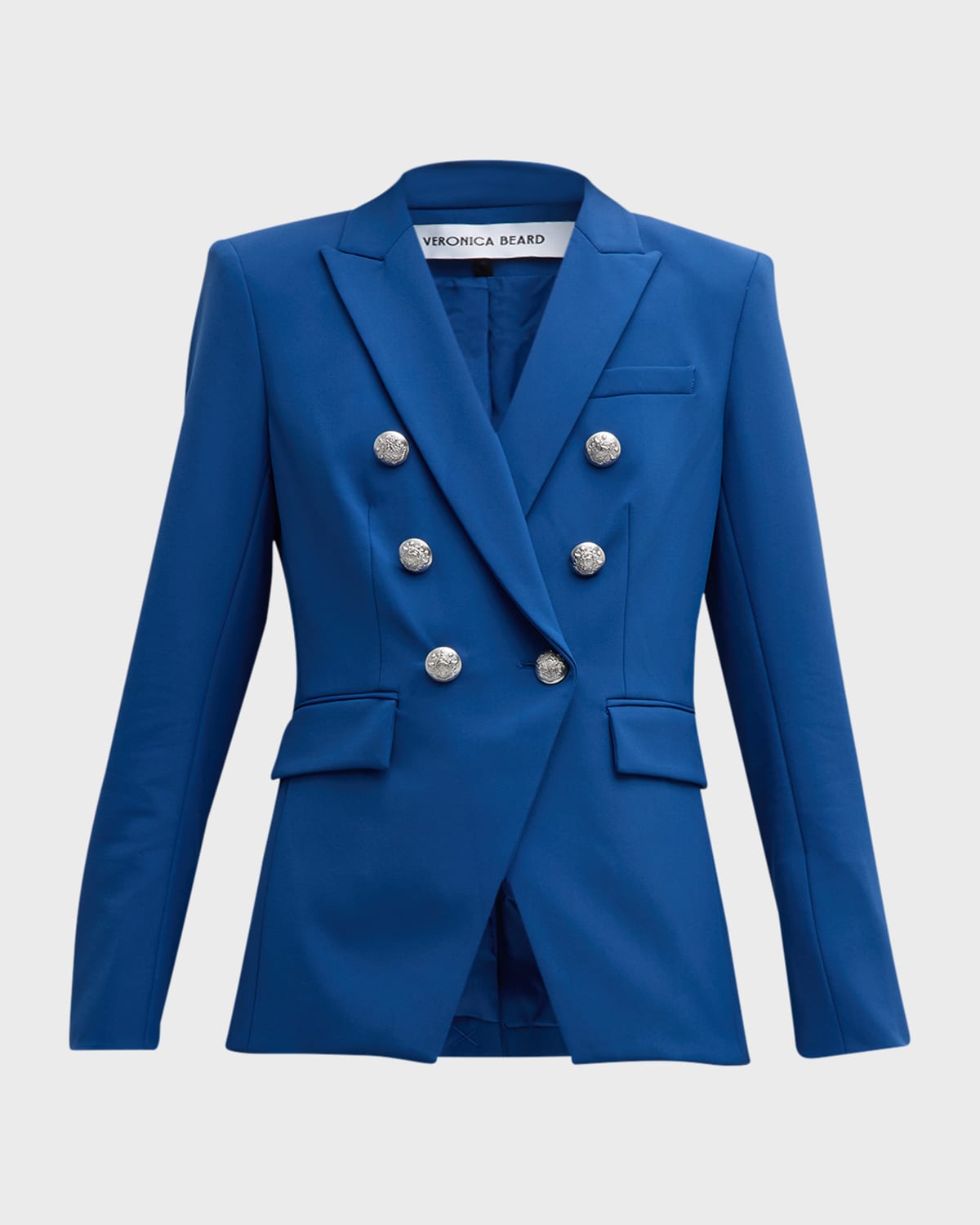 Veronica Beard "Miller" dickey jacket Compatible with Veronica Beard dickey's (sold separately) Peak lapels Doublebreasted front Long sleeves; button cuffs; approx. 32.8"L Chest welt pocket; hip flap pockets Tailored fit Vented back Cutaway hem Single button closure Nylon/polyamide/elastane Lining: Polyester Dry clean Made in USA from imported materials