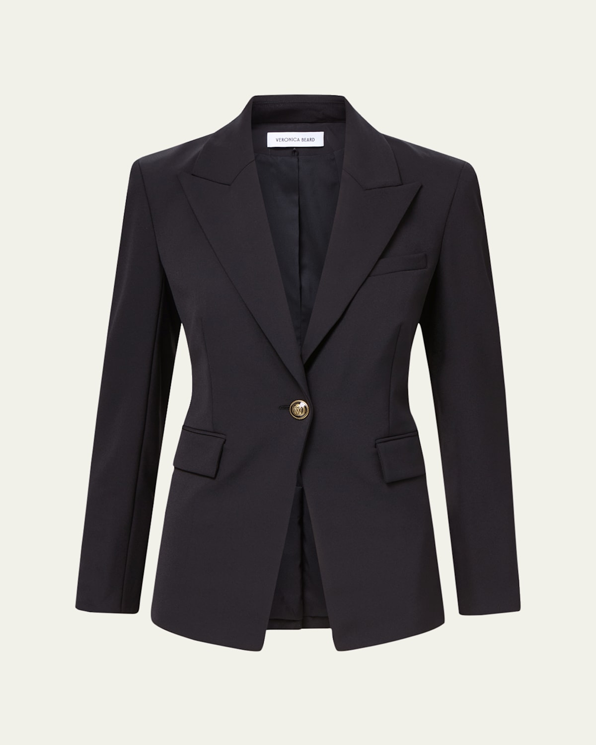 Veronica Beard "Naira" dickey jacket in premium stretch scuba Compatible with Veronica Beard dickey's (sold separately) Notch lapels Singlebreasted front Long sleeves with button cuffs; approx. 30.8"L Chest welt pocket Hip flap pockets Tailored fit Vented back Buttonfront Polyamide/elastane Lining: Polyester Dry clean Made in USA from imported materials