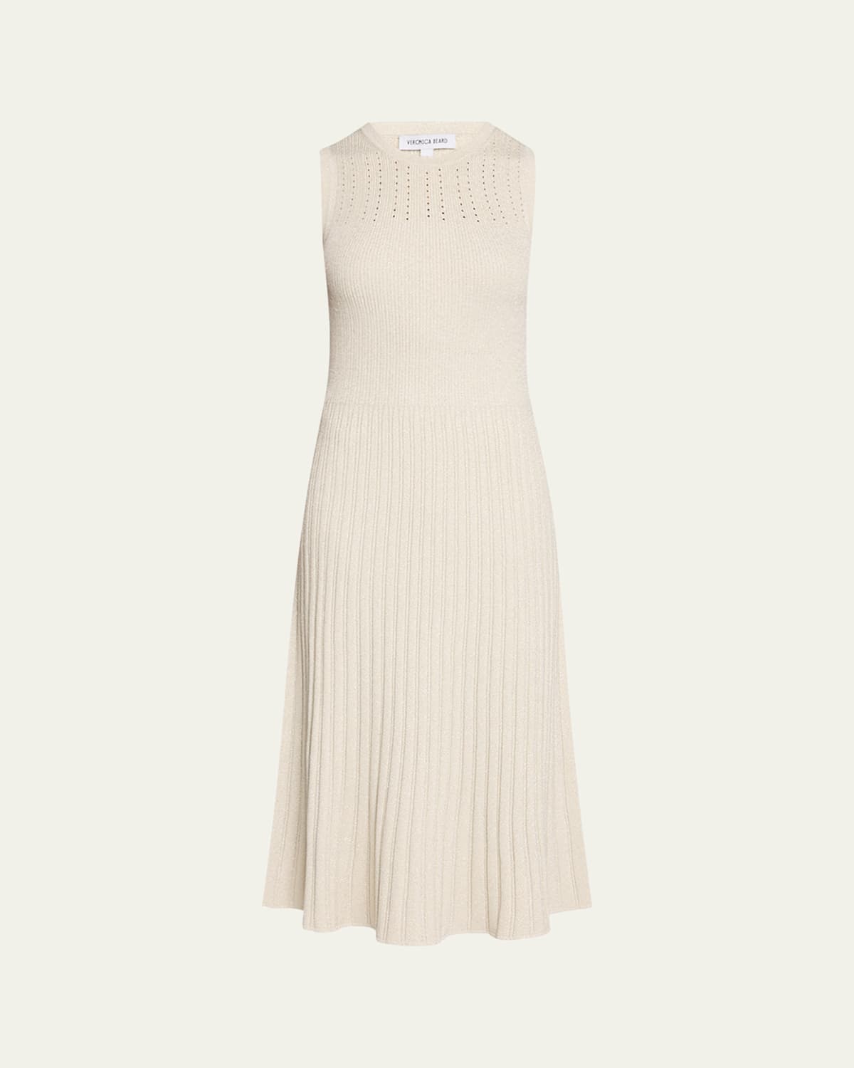 Veronica Beard "Nami" metallic knit midi dress finished with pleating Crew neckline Sleeveless Column silhouette Hem falls below the knee Slipover style Viscose/polyester Unlined Dry clean Imported