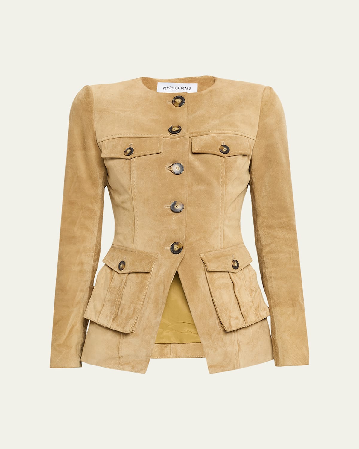 The "Orrin" jacket by Veronica Beard is crafted of luxurious goat suede and finished with flap pockets for a cargoinspired look Round neckline Singlebreasted front Long sleeves with button cuffs; approx. 32.5"L Tailored fit Cutaway hem Buttonfront Leather Lining: Cupro Dry clean Imported