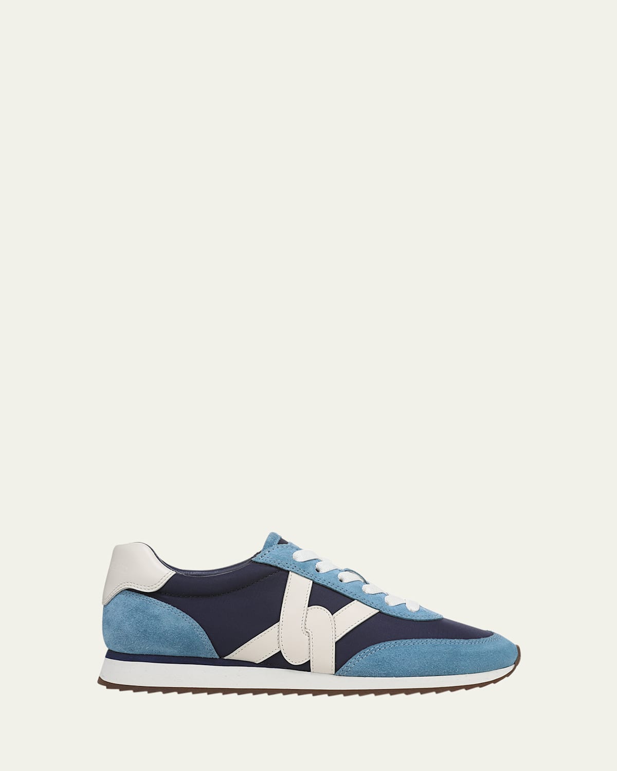 Veronica Beard "Penrose" suede, fabric, and leather runner sneakers 1.00 in / 25 mm flat heel Round reinforced toe Laceup vamp Cushioned footbed Rubber outsole Lining: Leather Spot clean Imported