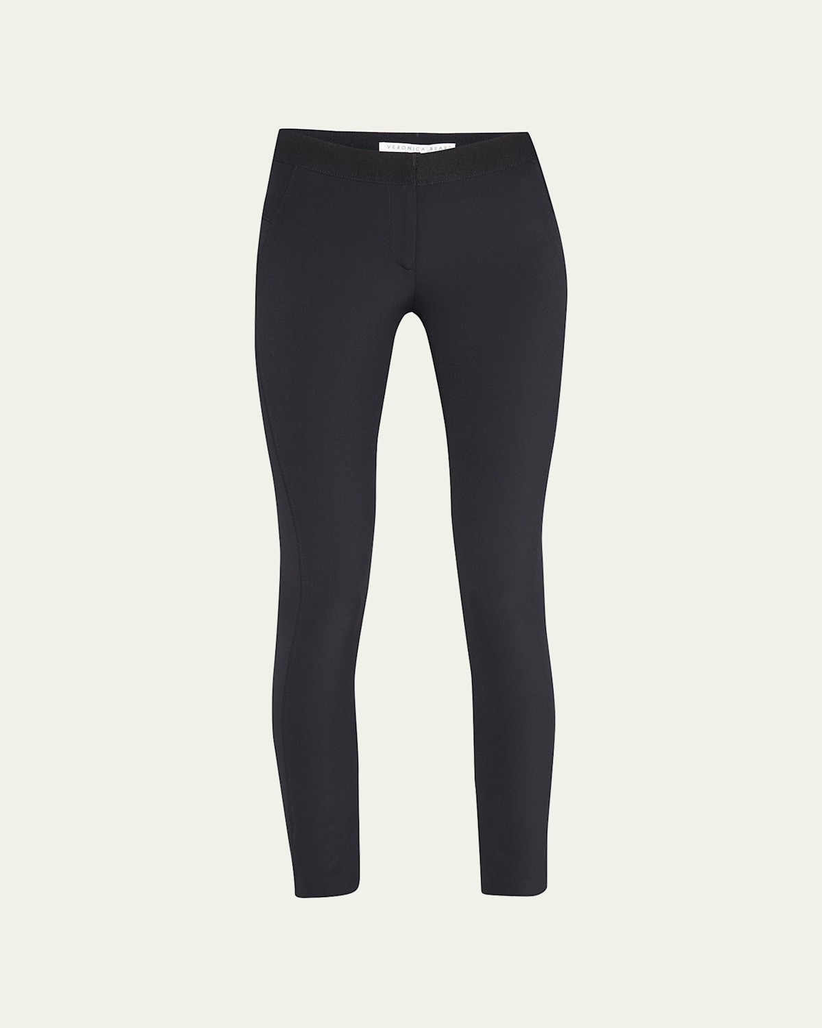 Veronica Beard leggings in scubastyle jersey. Approx. measurements: 9" rise; 10" leg openings; 27.63" inseam; 35.8" outseam (size small measured). Smooth, flat front. Skinny legs. Hook/zip front. Nylon/spandex/nylon; dry clean. Made in USA of Italian material.