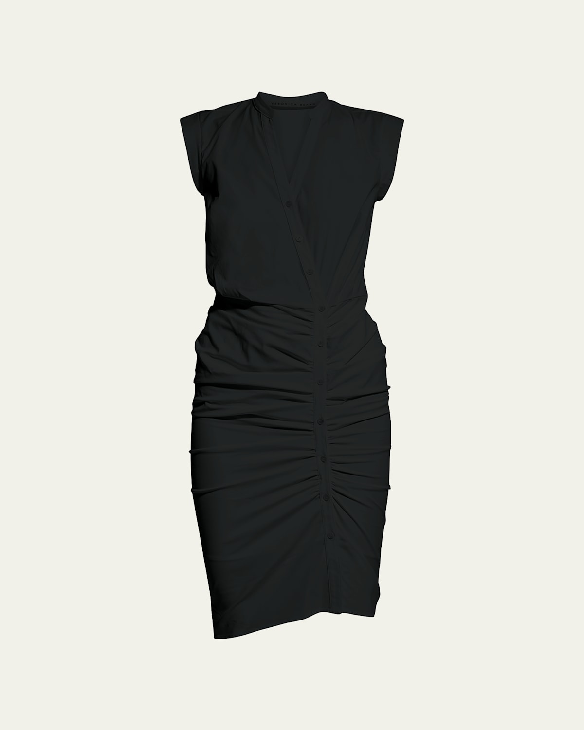 Veronica Beard poplin shirtdress in stripes. Approx. 46"L from shoulder to hem. Inverted collar; asymmetric button front. Sleeveless; extended shoulders. Sheath silhouette. Ruched through skirt. Arched hem hits knee. Cotton/spandex; dry clean. Imported.