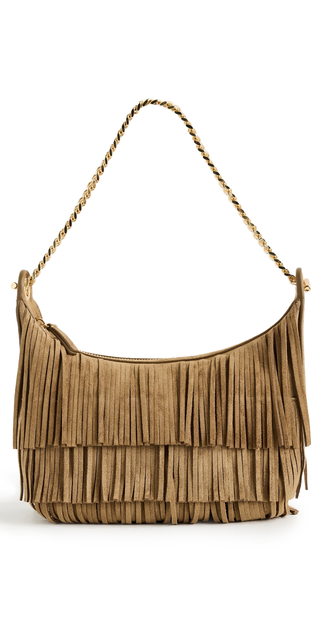Suede. Fringe trim. Zip at top. Optional, adjustable strap. Lining: Suede. Weight: 28oz / 0.79kg. Imported, Vietnam. Measurements: Height: 6in / 15cm Length: 5.5in / 14cm Depth: 2.25in / 6cm Strap drop: 8.25in / 21cm Handle drop: 19in / 48cm