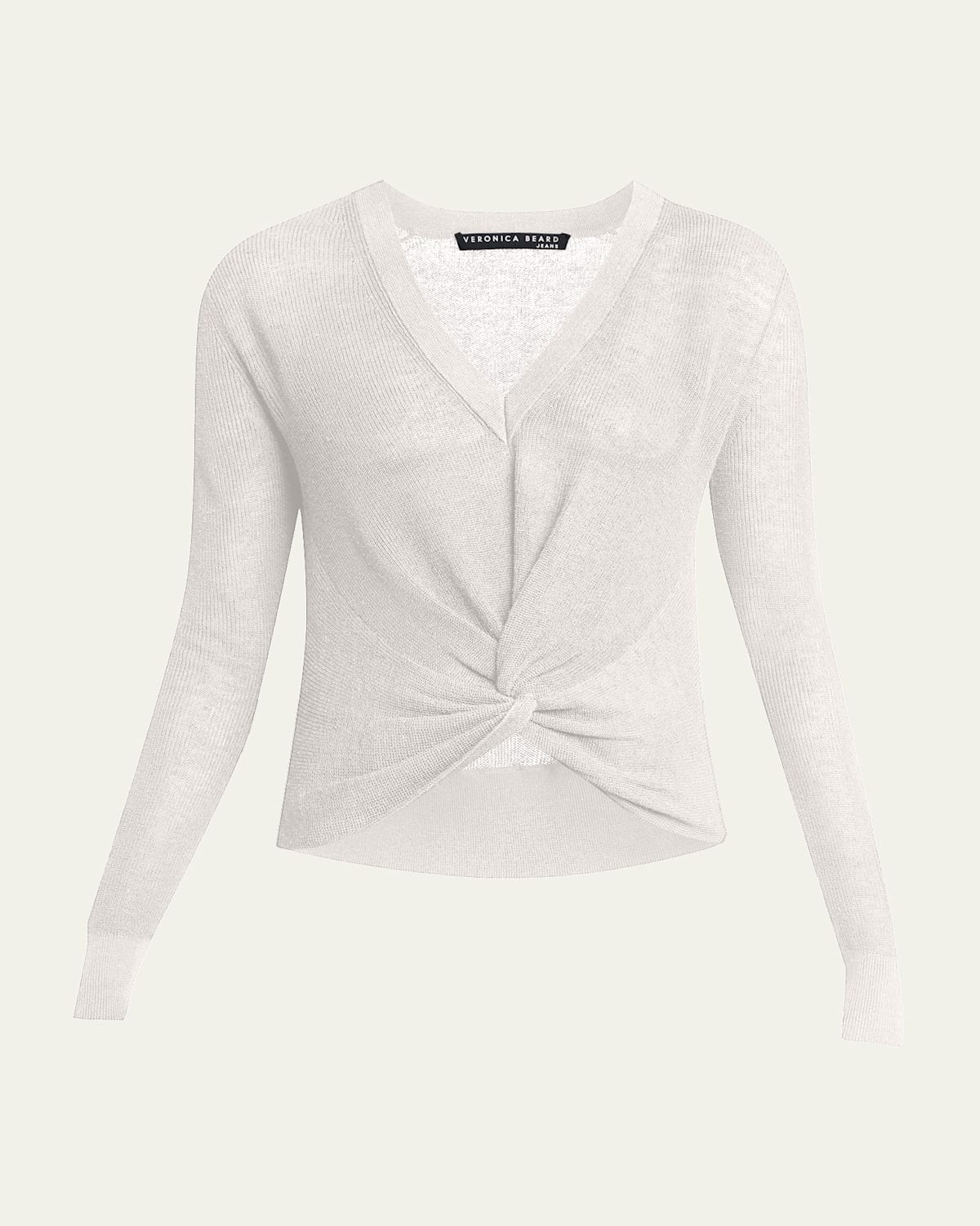 Veronica Beard "Soren" linenblend sweater. V neckline. Long sleeves. Relaxed fit. Knotted hem. Pullover style. Linen/nylon. Made in USA of imported material.