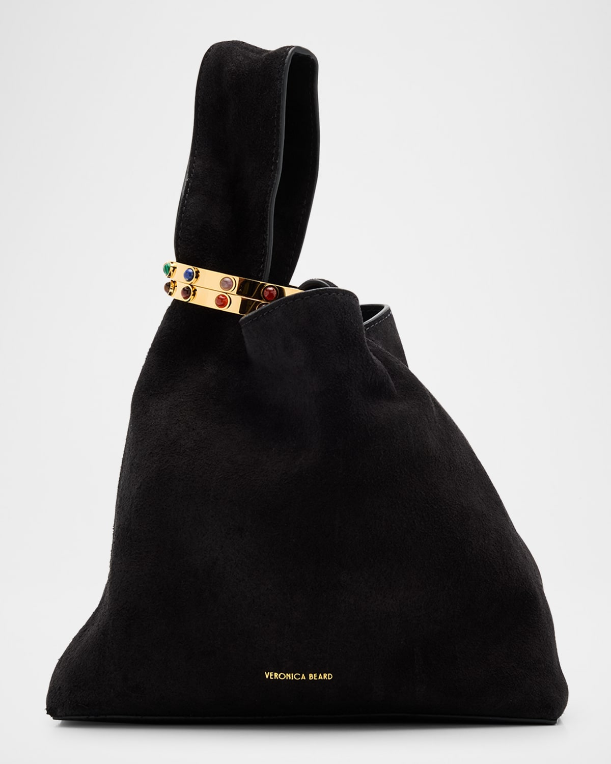 Crafted in butterysoft Italian suede, this Veronica Beard "Swing" wristlet bag features a slouchy silhouette embellished with double bracelet rings Bracelet rings studded with semiprecious stones of malachite, lapis, amethyst, tiger's eye, and sardonyx Wristlet strap with bracelet rings, 5.1" drop Open top Lining: Leather Approx. 8.7"H x 10.8"W x 3"D Professional cleaning recommended Imported