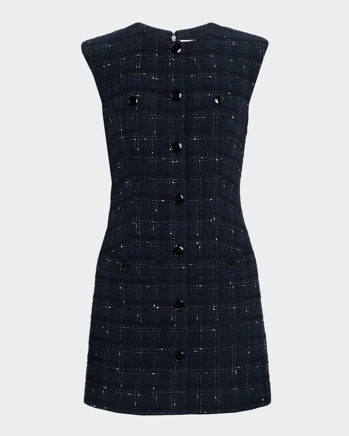 Crafted in sparkly windowpane tweed, the "Tamara" mini dress by Veronica Beard features a buttonfront, completing a polished silhouette that is the perfect officetodinner look. Scoop neckline Sleeveless Chest and hip welt pockets Tailored fit Hem falls above the knee Center back zip Cotton/polyester/acrylic Dry clean Made in USA