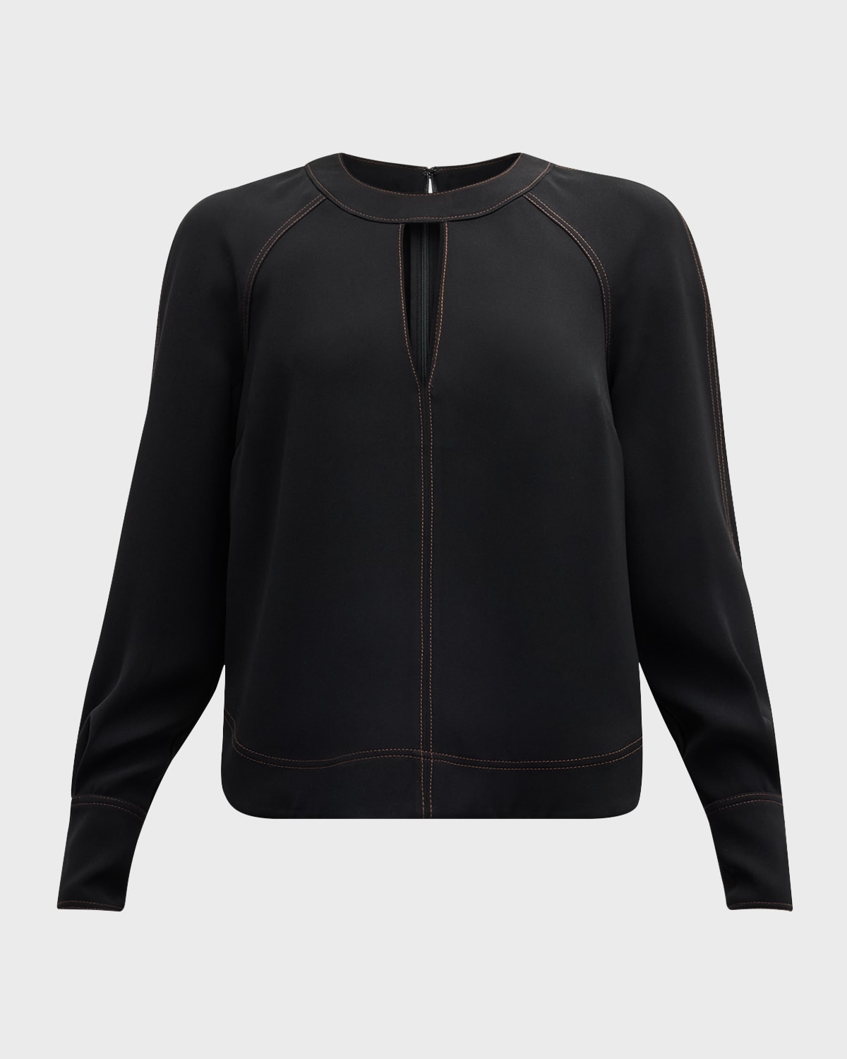 Veronica Beard "Tena" top featuring contrast topstitching Crew neckline with cutout Long sleeves with button cuffs; approx. 32.3"L Slim fit Hem sits at the hip Invisible back zip Polyester Dry clean Imported