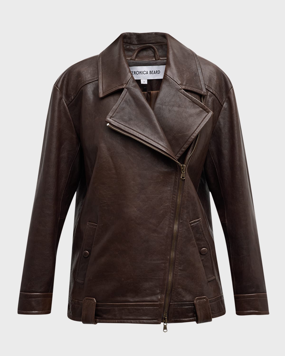 Veronica Beard "Thandie" motoinspired dickey coat in lambskin leather Compatible with Veronica Beard dickey's (sold separately) Wide notched collar; asymmetric zipfront Dropped shoulders Long sleeves with button cuffs; approx. 30.8"L Angled snap pockets Relaxed fit Hem falls to the hip Leather Lining: Polyester Dry clean Imported