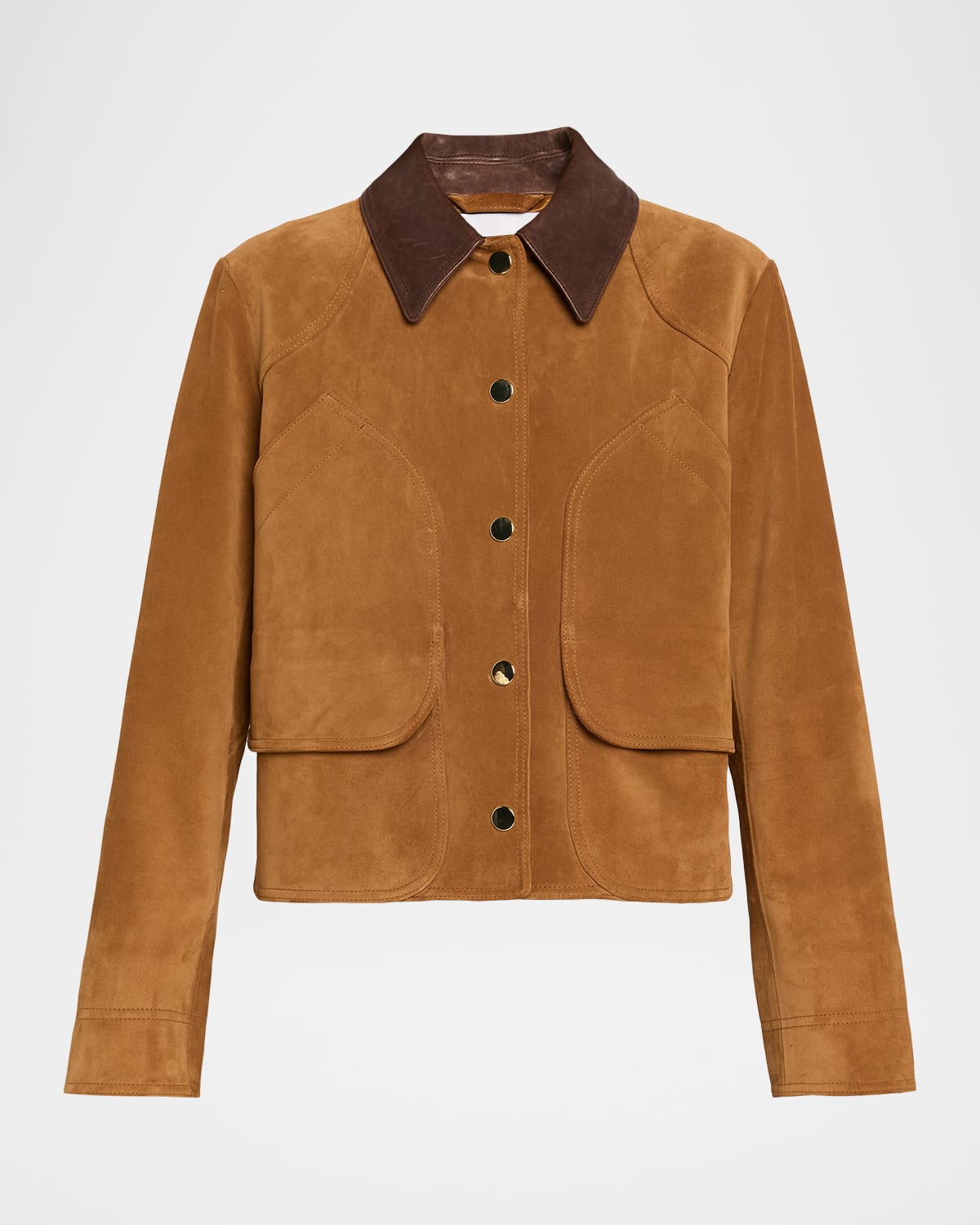 Crafted from supersoft calf suede, the "Walters" jacket by Veronica Beard offers an elevated take on the classic utility jacket with a contrasting collar and oversized pockets for added flair. Spread collar Long sleeves with snap cuffs Back box pleat Boxy fit Cropped length Snapfront Leather Leather method dry cleaning Imported
