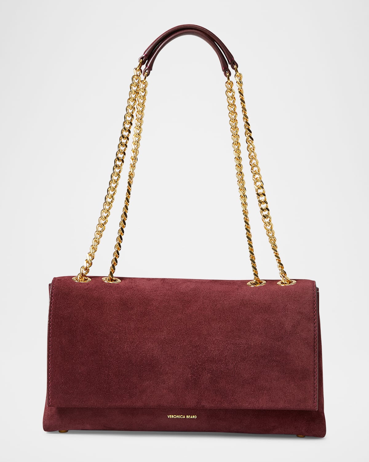 Designed with gusseted sides for a triangular shape, this Veronica Beard "Wedge" bag is crafted in suede with a soft, napped finish and subtle goldtone logo lettering Sliding chain/leather shoulder straps, 11" double strap drop Can be worn as a shoulder or crossbody strap Flap top with magnetic closure Interior, one zip pocket Lining: Sueded microfiber Feet protect the bottom of the bag Approx. 7.1"H x 11.6"W x 3.2"D Professional cleaning recommended Imported