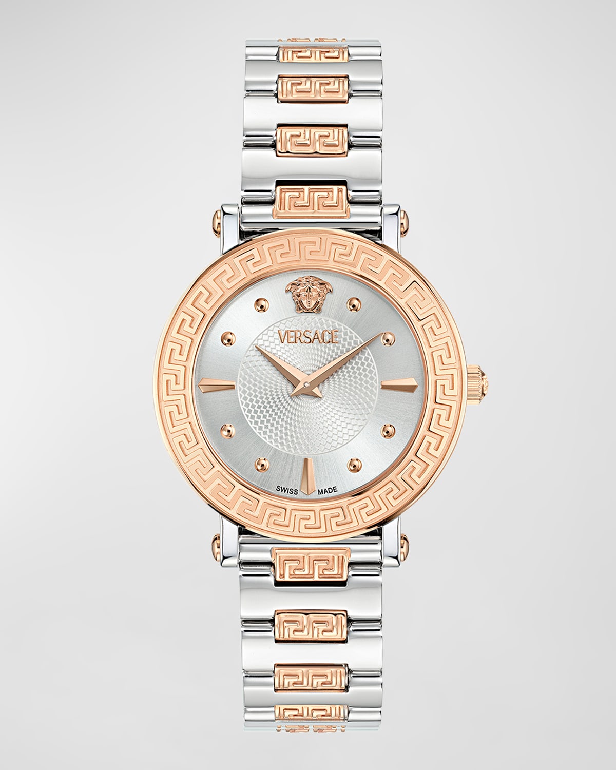 Greca Sphere watch from Versace Approx. 35mm round case Twotone ionplated stainless steel Silver guilloché dial with Greca bezel Medusa and logo text at 12 o'clock Dots and batons as time markers Hlink bracelet strap with a deployant buckle Twohand quartz movement Water resistant to 5 ATM Sapphire crystal window Made in Switzerland