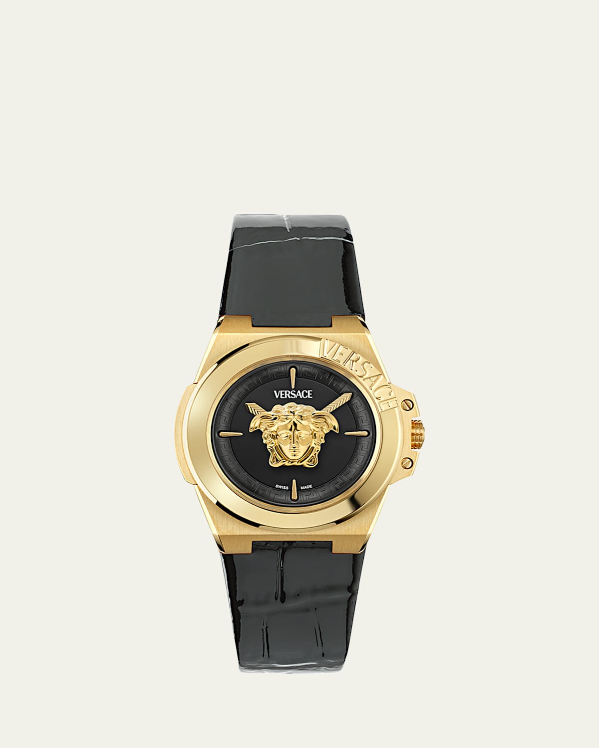 Versace Hera watch Case dimensions: approx. 37mm Approx. 4.53"L and 2.56"L x 0.5"W strap Golden ionplated stainless steel case Black sunray dial with four baton indices Greca key, logo text and Medusa at the dial Smooth bezel engraved with logo text Black calf leather strap with a deployant buckle Twohand quartz movement Water resistant to 5 ATM Sapphire crystal window Spot clean Made in Switzerland