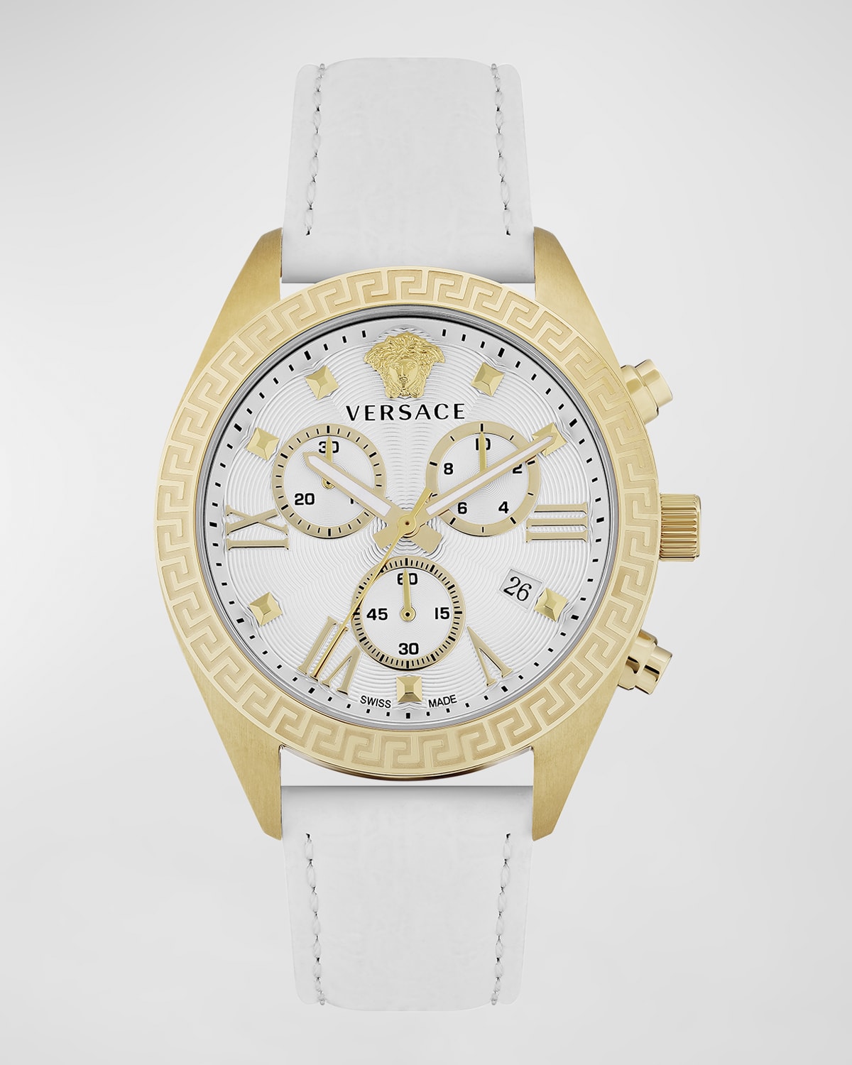 Versace watch Approx. 42mm round case Yellow goldplated stainless steel 40mm round case White guilloché dial Greca detailing at bezel Studs and Roman numerals Medusa and logo text at 12 o'clock Three subdials; 4 o'clock date window Water resistant to 5 ATM Calf leather bracelet strap with adjustable buckle Chronograph movement Made in Switzerland