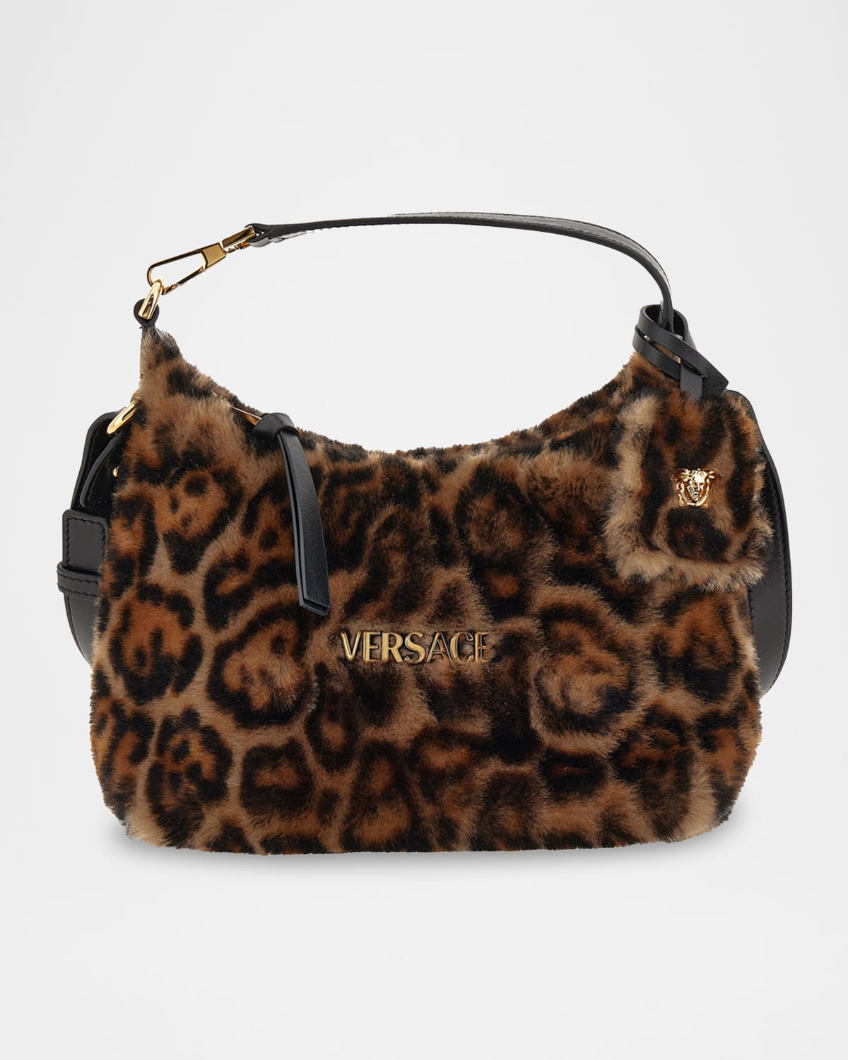 Versace hobo bag in jaguarprint faux fur (acrylic/polyester) and lambskin leather Detachable leather top handle Detachable, adjustable shoulder strap Can be worn as a top handle or shoulder bag Removable signature Medusa tag Zip top closure Interior, one card slot Lining: Polyester Trim: Leather Approx. 6.3"H x 9.1"W x 4.3"D Made in Italy