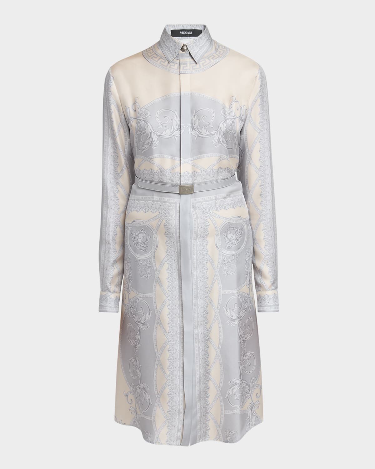 Versace coupe des dieux dress in barocco foulard print Spead collar; covered button front Long sleeves; button cuffs Belted waist Aline silhouette Knee length Silk/motherofpearl Professional cleaning recommended Made in Italy