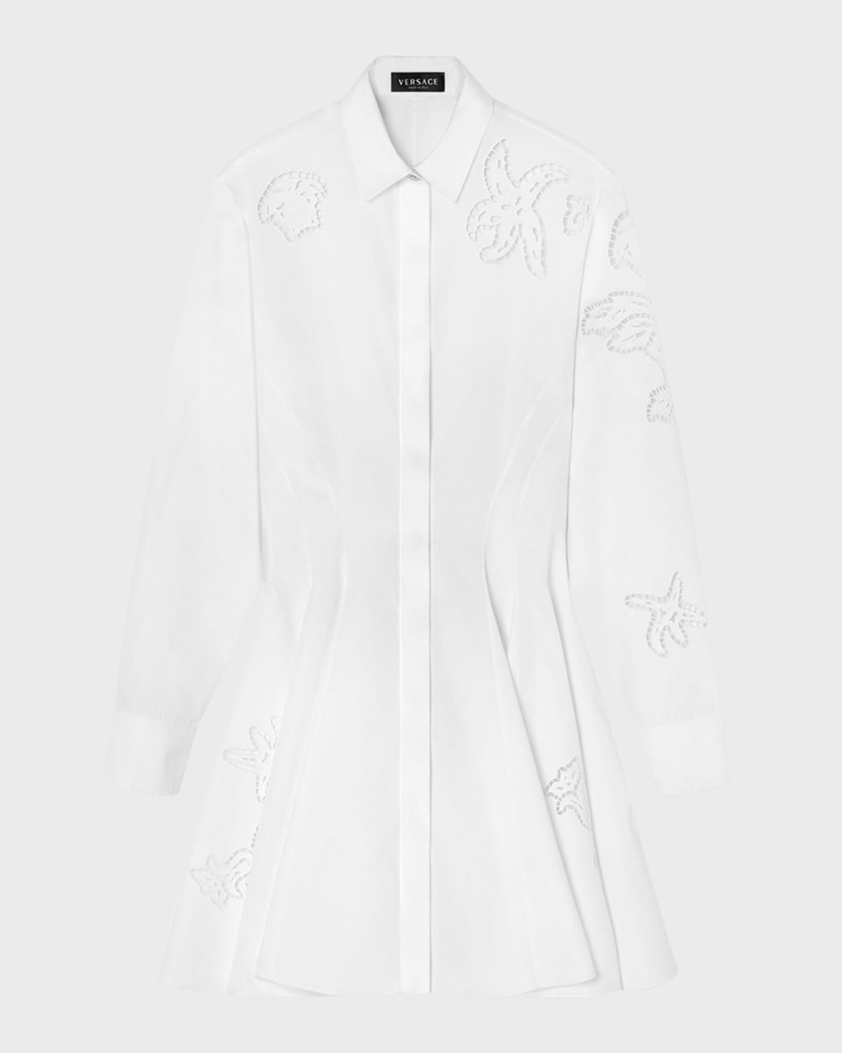 Versace cotton poplin shirtdress featuring Baroque A Jour embroidery Point collar; concealed button front Long sleeves; button cuffs Fitandflare silhouette Midthigh length Cotton Made in Italy