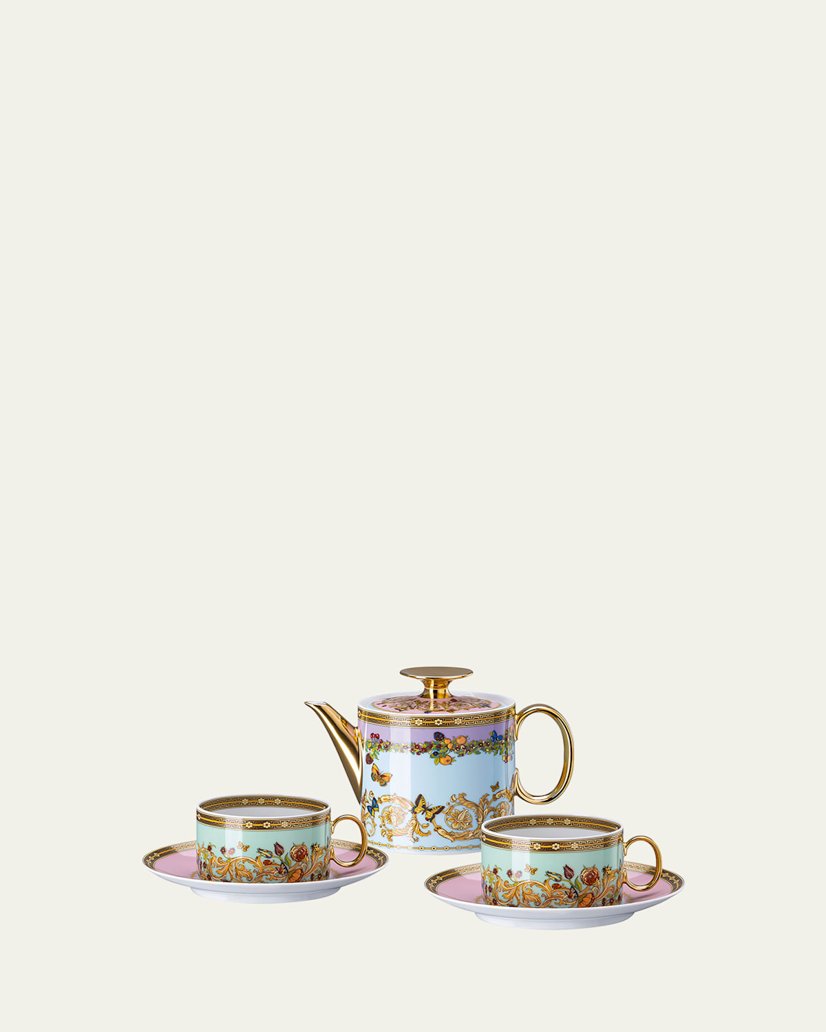 New modern coupe shape mixes beautifully with the traditional butterfly garden motif Includes two teacups, two saucers, and a teapot Crafted of porcelain Mugs capacity, 11 oz Teapot capacity, 16 oz Dishwasher safe Set of five Made in Germany