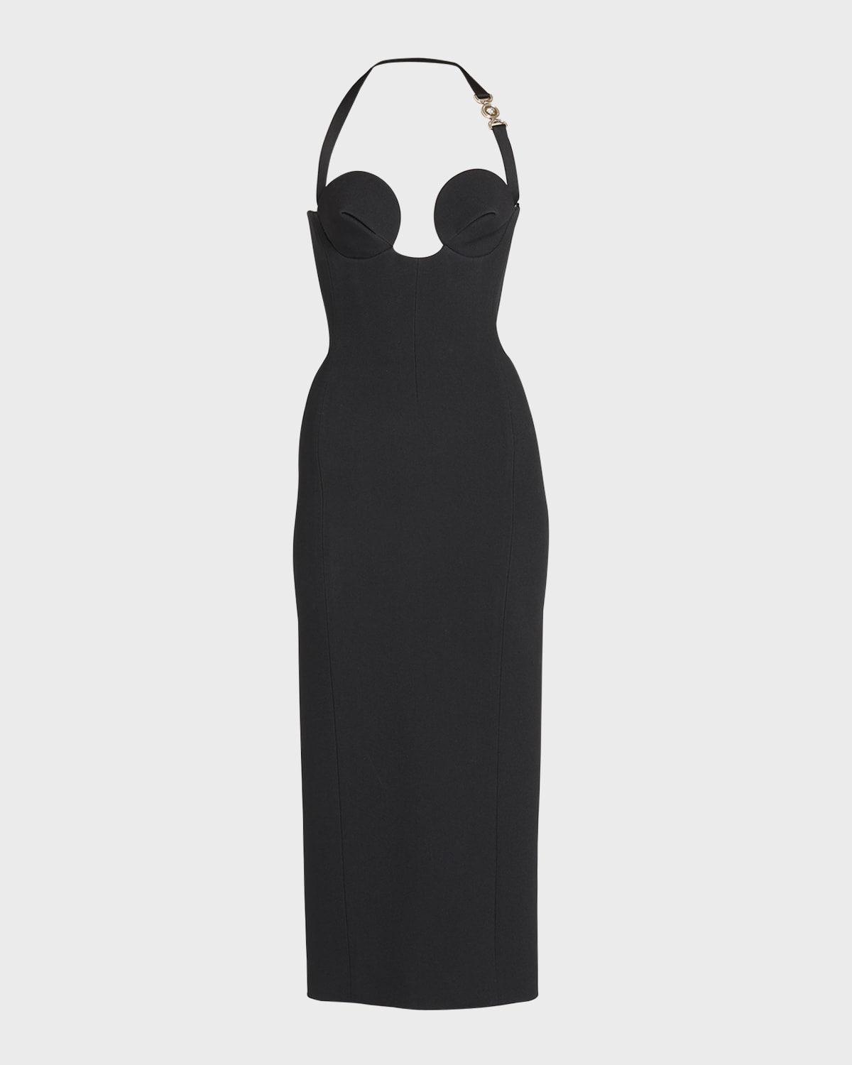 Versace enver satin dress featuring pointed cone bust and signature Medusa detail Sweetheart neckline Sleeveless Sheath silhouette Hem falls below the knee Centerback slit hem Invisible back zip Acetate/viscose Made in Italy
