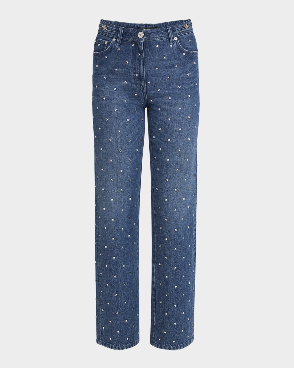 Versace medium wash denim pants featuring allover crystal embellishment and signature Medusa waist details Mid rise sits high on hip Fivepocket style Straight legs Full length Button/zip fly; belt loops Cotton Professional cleaning recommended Trim: Leather Made in Italy