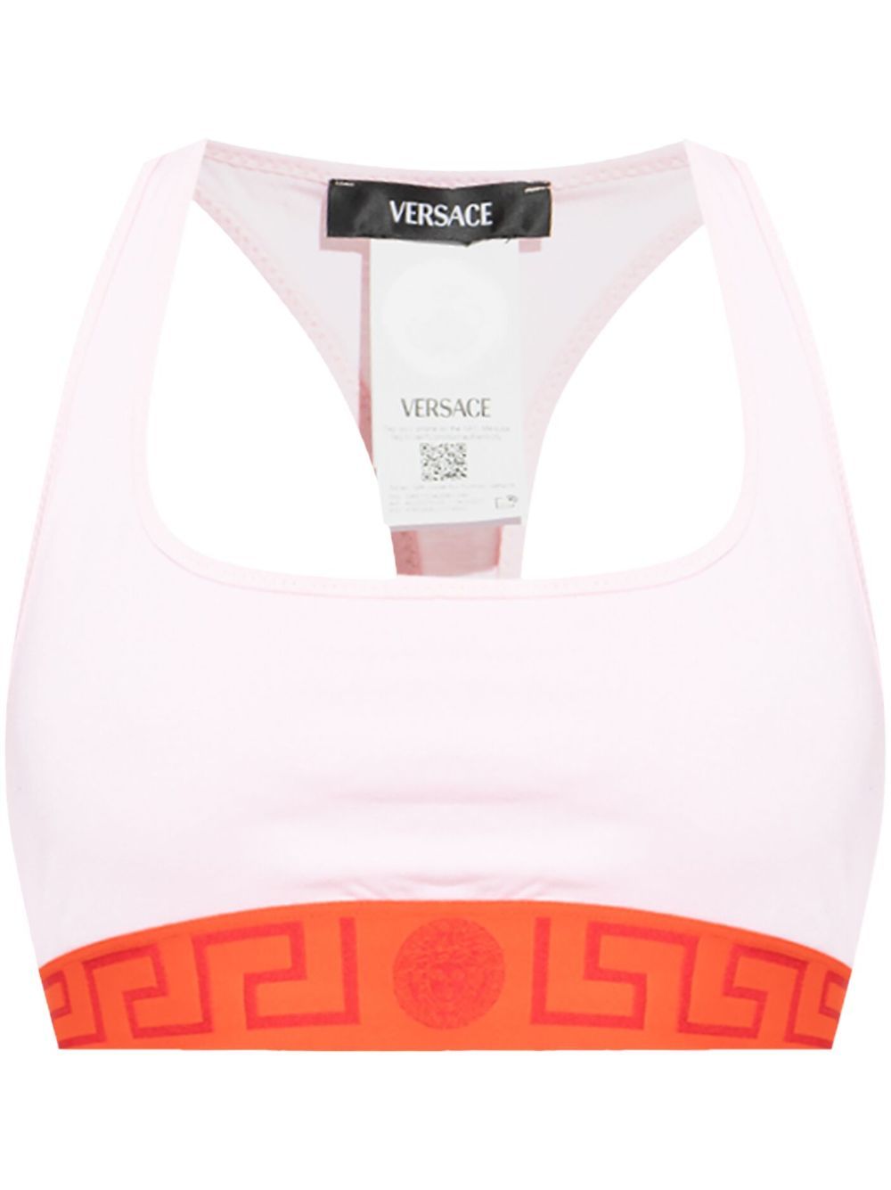 light pink/coral red stretch-cotton jersey texture slip-on style wide shoulder straps square neck signature Greca detailing elasticated underband racerback bralette style Just a reminder that this piece must be tried on over your own garments.