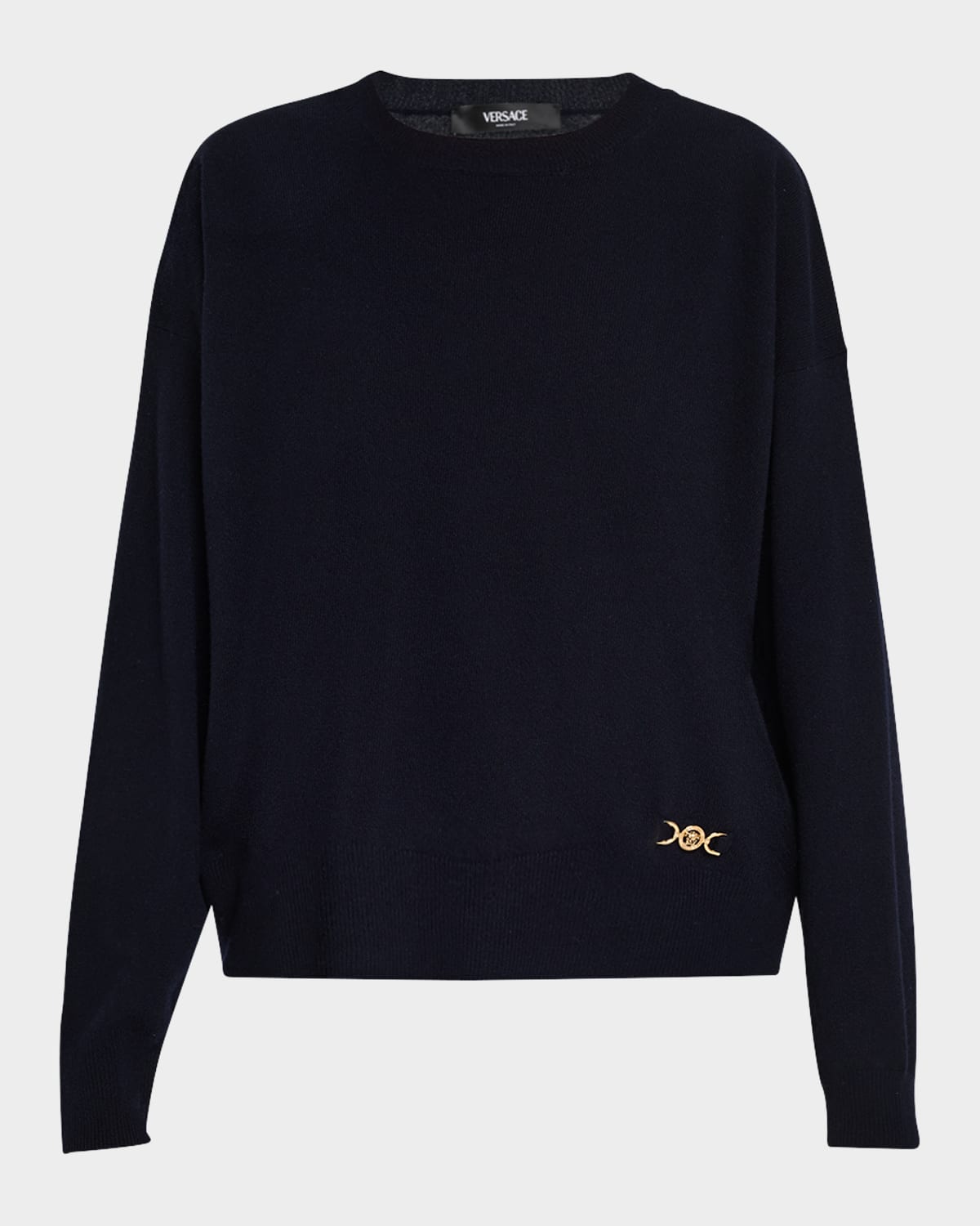 Versace knit sweater featuring a goldtone Medusa detail on the hem Crew neckline Long sleeves Loose fit Ribbed cuffs and hem Pullover style Virgin wool/cashmere/elastane Professional cleaning recommended Made in Italy