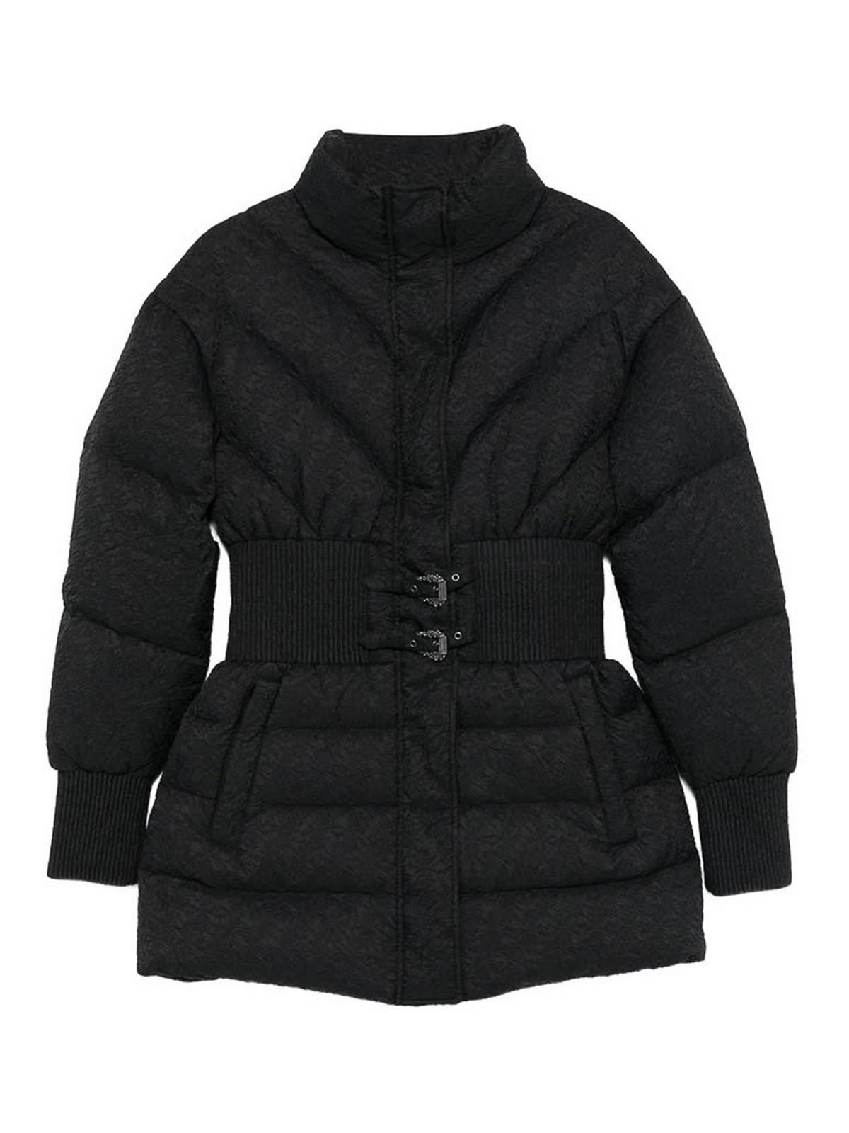 Design matelassé noir, ceinture ceinturée, col montant, manches longues