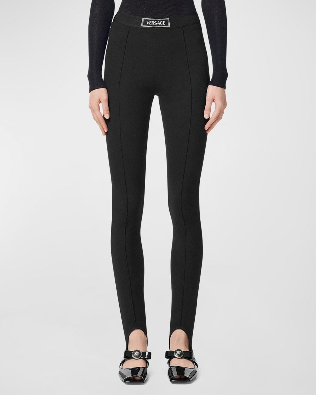 Versace "Jebina" stirrup legging in punto Milano knit with a pintuck front and logo elasticized waistband Mid rise sits high on hip Skinny legs Secondskin fit Cropped at the ankle Strap hem Pullon style Viscose/nylon/polyamide/elastane Professional cleaning recommended Made in Italy