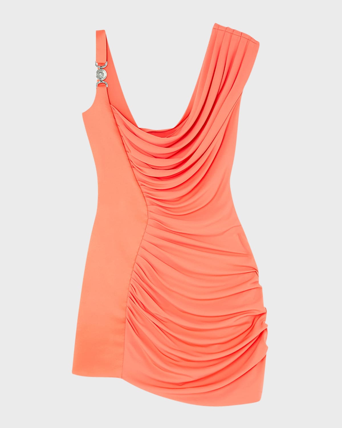 Versace jersey and enver satin mini dress features a draped front styling and "Medusa" hardware at the strap Scoop neckline Sleeveless Bodycon silhouette Hem falls above the knee Viscose/elastane Made in Italy